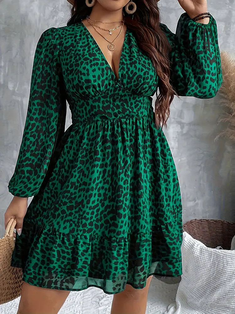 New Sexy V-Neck Leopard Print Long-Sleeve Dress Plus Size Women Clothing American Slim A-Line Skirt Elegant Party Evening Dress