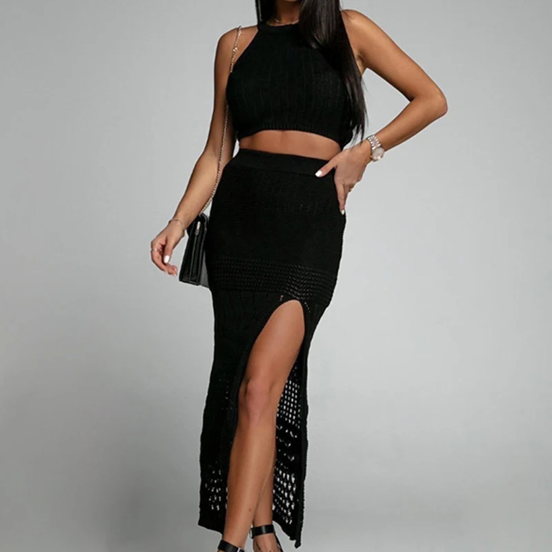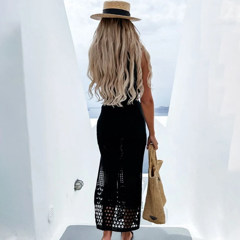 New Style Knitting Solid Color Tank Top Texture Slit Dress Ladies Beach Sunscreen Dress Suit Hollow Out Beachwear Cover Up