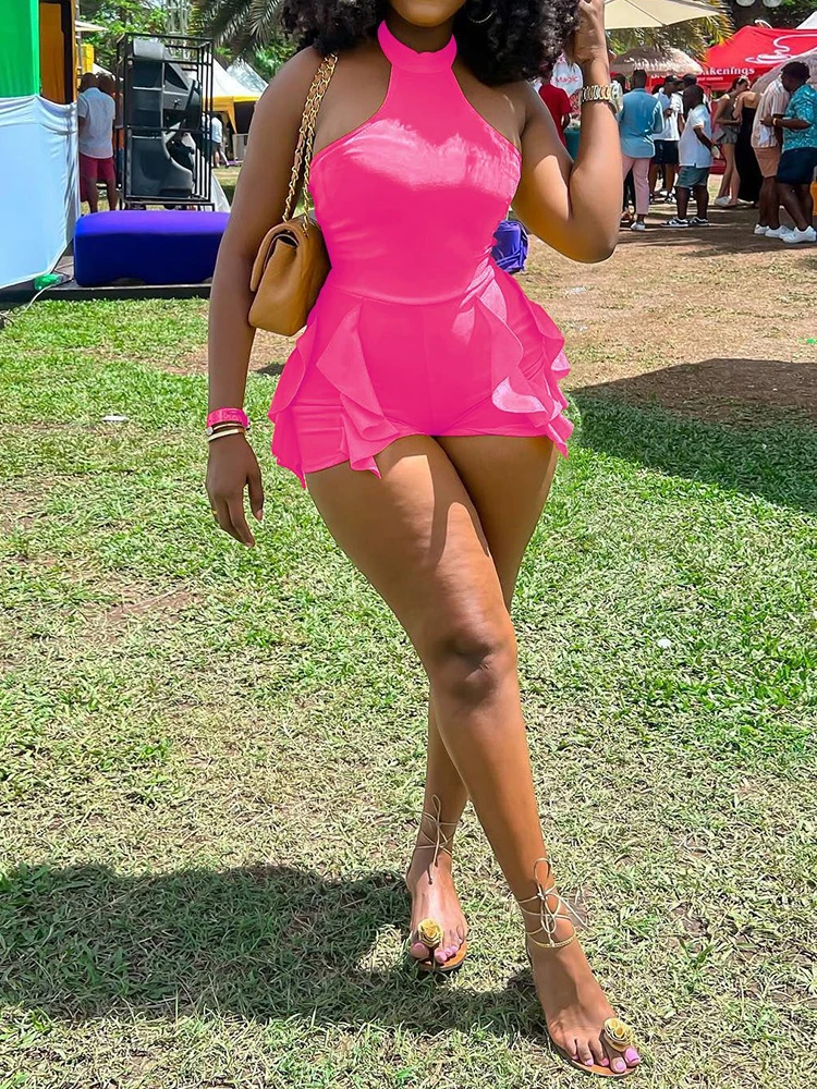 OMSJ 2023 Casual Tank Jumpsuit Shorts For Women Halter Neck Sleeveless High-waisted Ruffled Solid Playsuits Sexy Club Streetwear