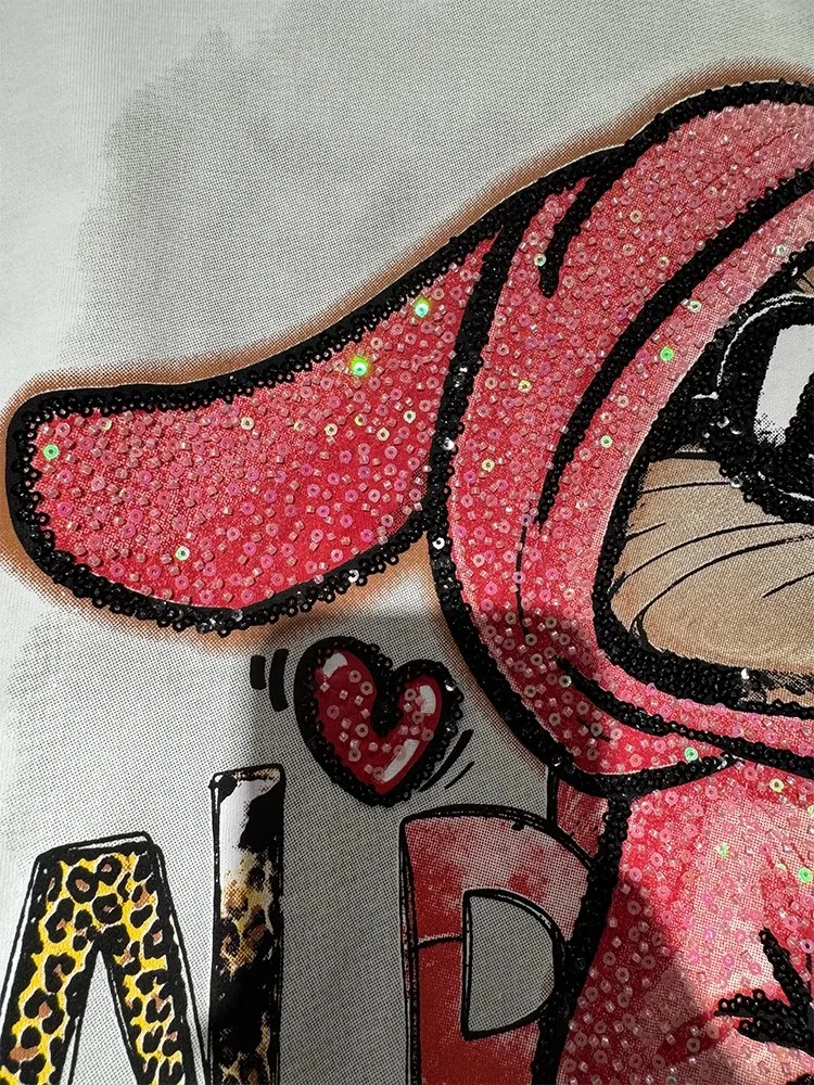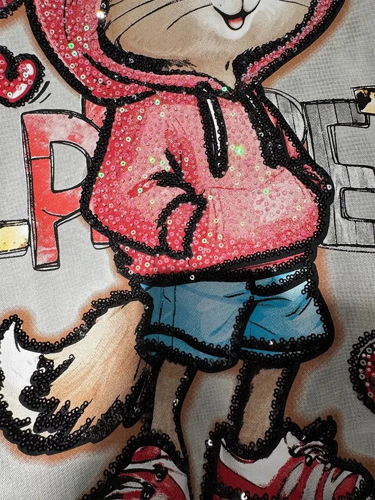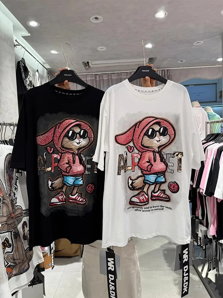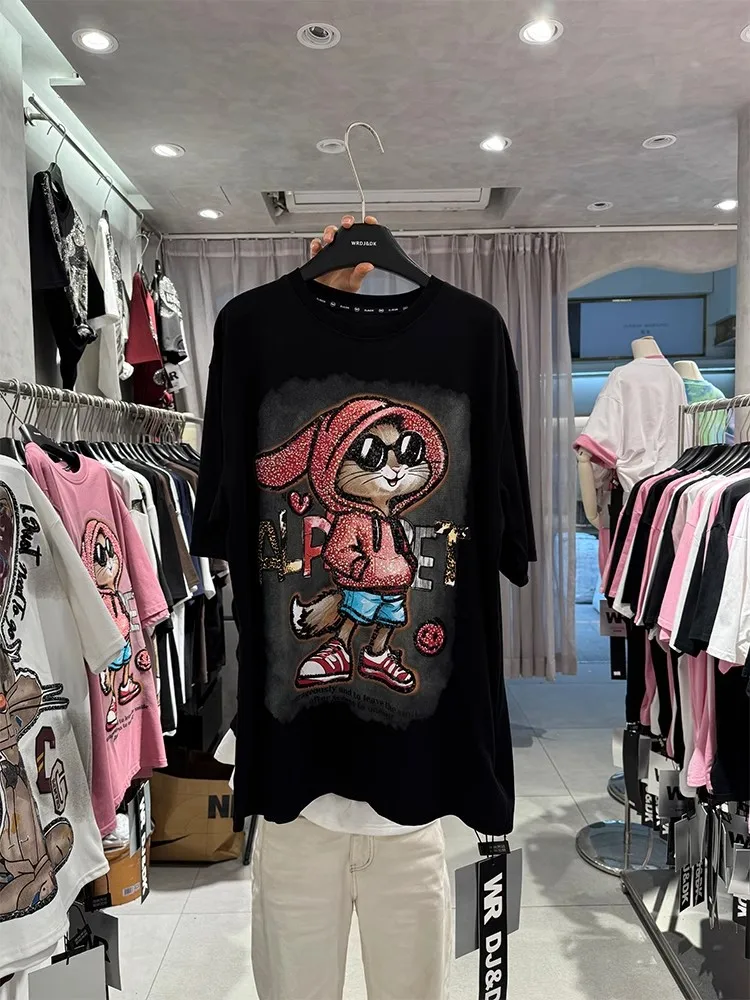 Oversized Rhinestone Rabbit mid-length half-sleeved top 100% cotton women’s short-sleeved T-shirt