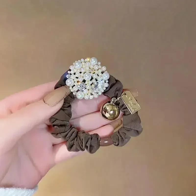 Pearl rhinestone head rope female ponytail vintage simple temperament high-grade sense hair rope leather band ball head large co