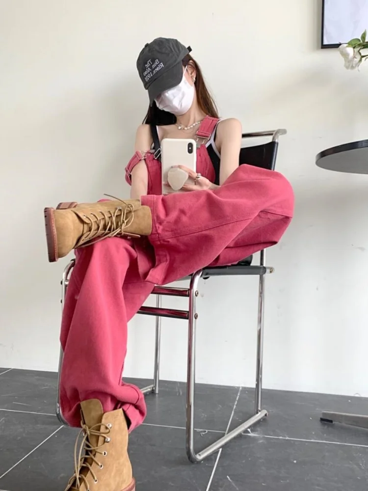 Pink Denim Overalls For Women Loose Slimming High Waist Straight Wide Leg Pants Student Style Jumpsuits