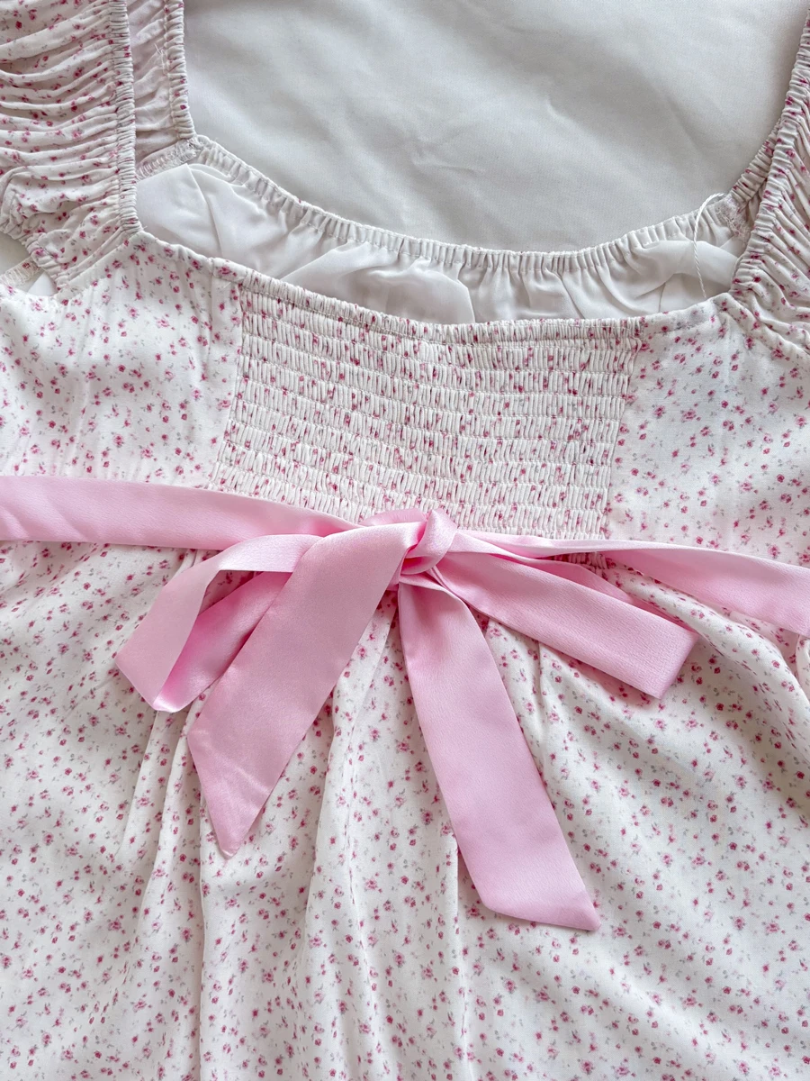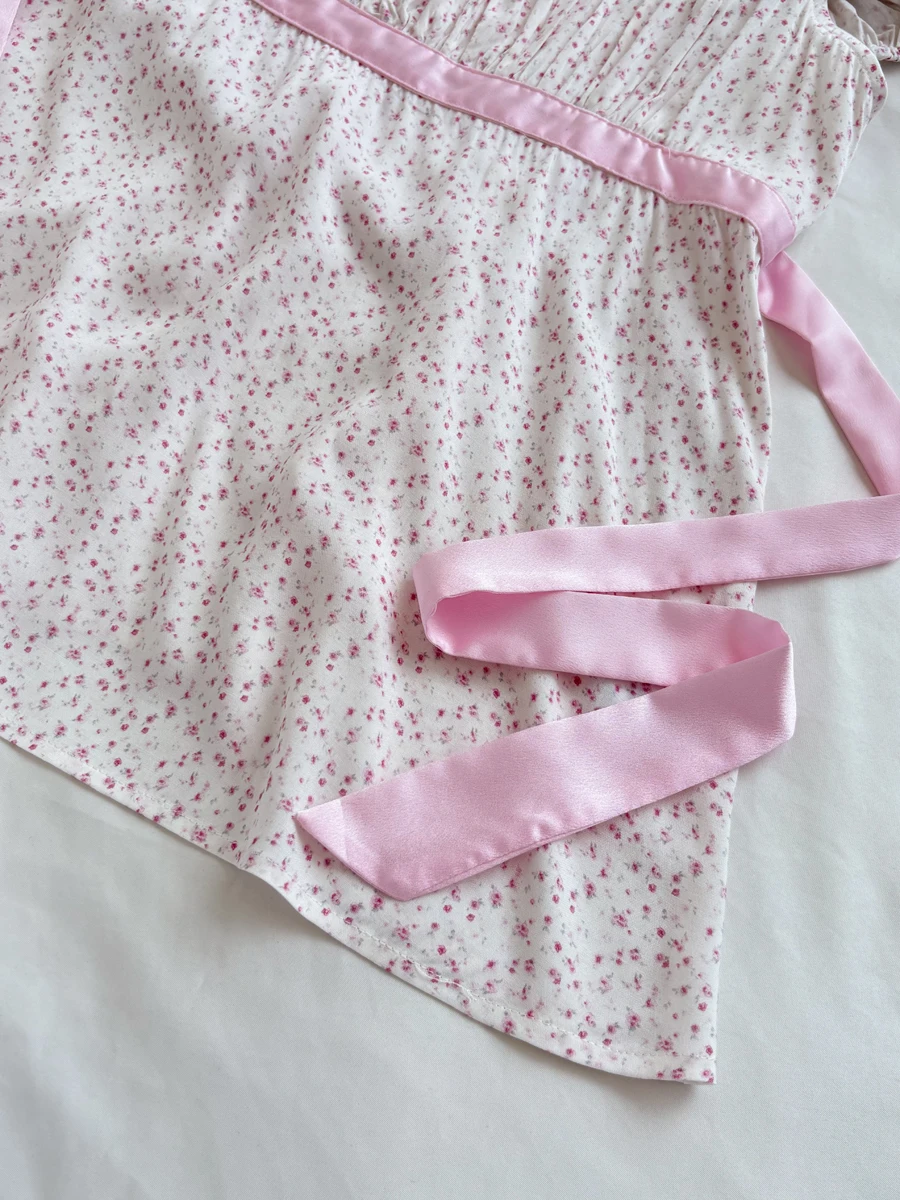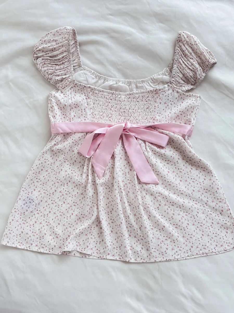 Pink Floral Print Cinched T-shirt Blouse Women Sexy Folds Square Collar Lace-up T-shirts Summer Sweet Vintage Backless Tops Tees