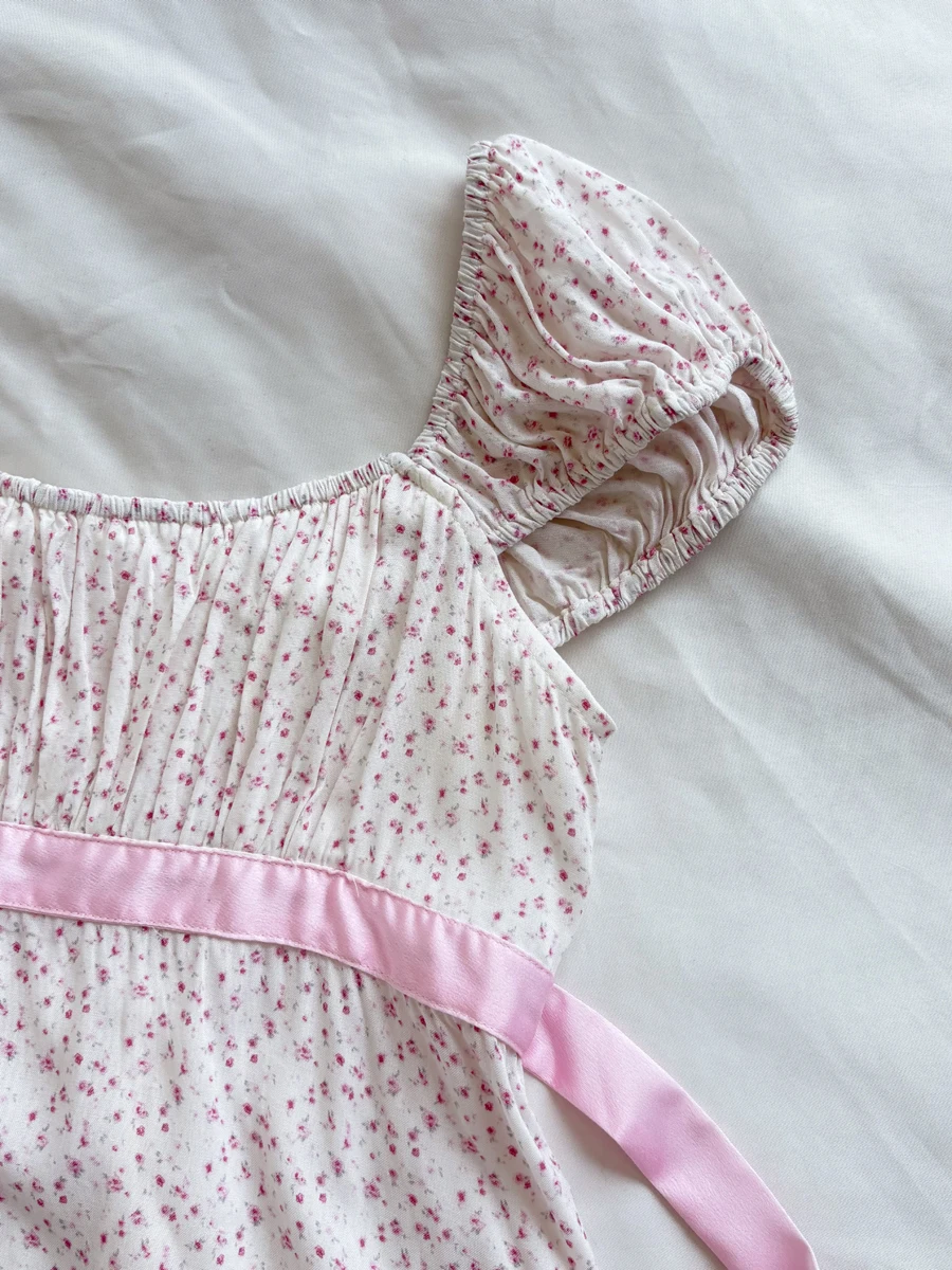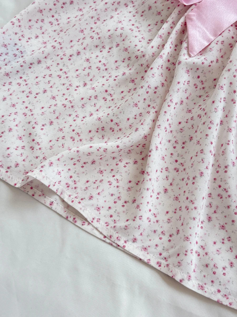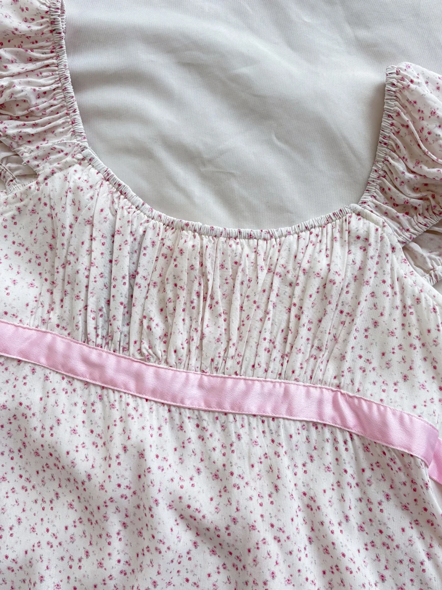 Pink Floral Print Cinched T-shirt Blouse Women Sexy Folds Square Collar Lace-up T-shirts Summer Sweet Vintage Backless Tops Tees