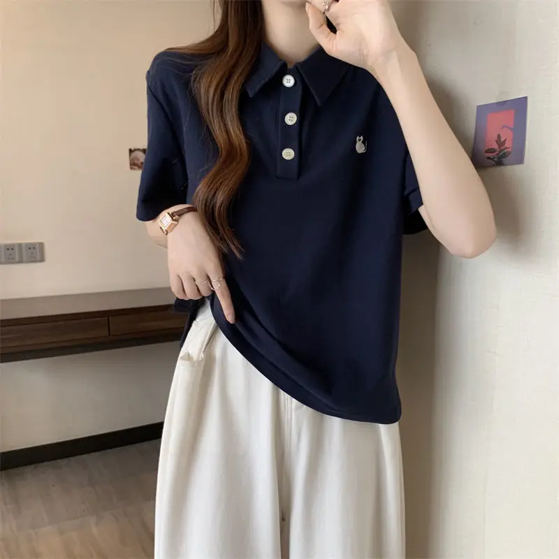 1 review for Pink Woman 100℅ Cotton Tshirt Embroidery Polo Neck T Shirt for Women Korean Clothing Y2k Fashion High Quality Youthful Elegant