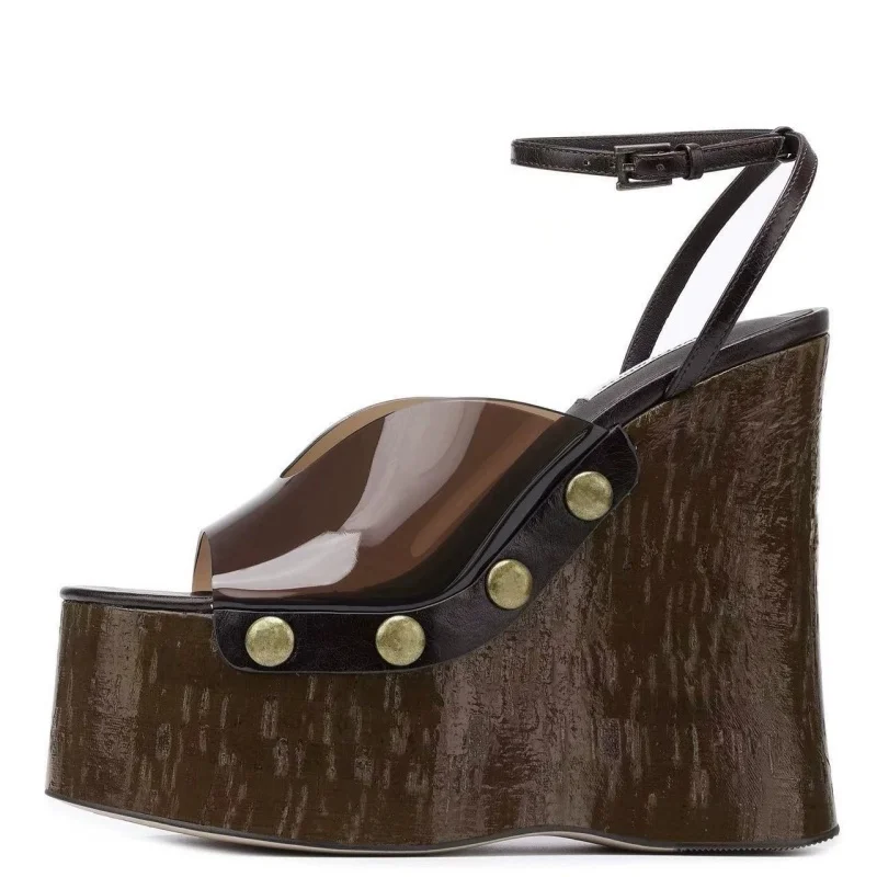 Platform Wedges Wood Grain Women’s Sandals High Heels Crude Heel Female Pumps Metal Rivet Peep Toe Ladies Thick Bottom Shoes