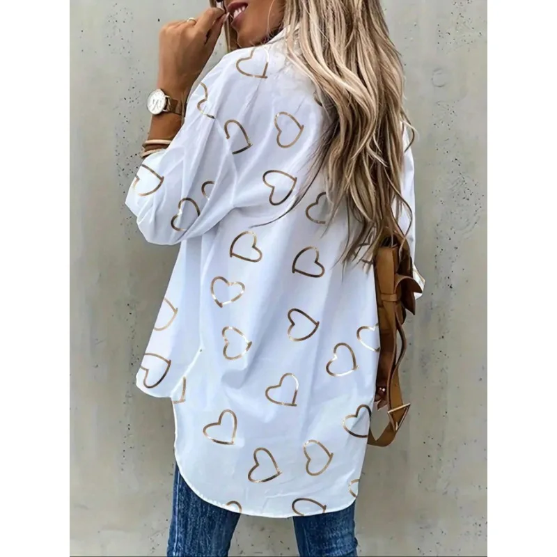 Plus Size 1XL-5XL Women’s Fashionable Lapel Single Breasted Heart-shaped Printed Casual Long Sleeved Comfortable Shirt