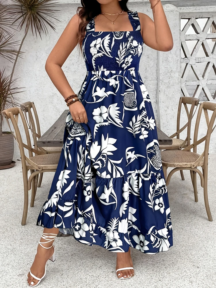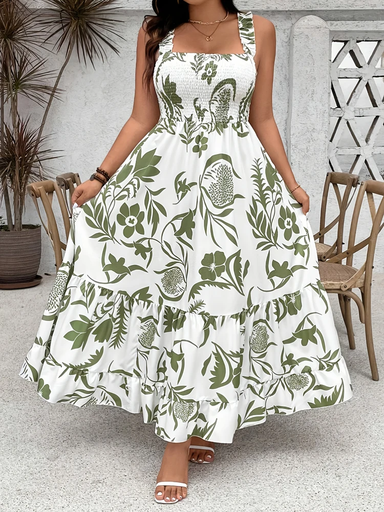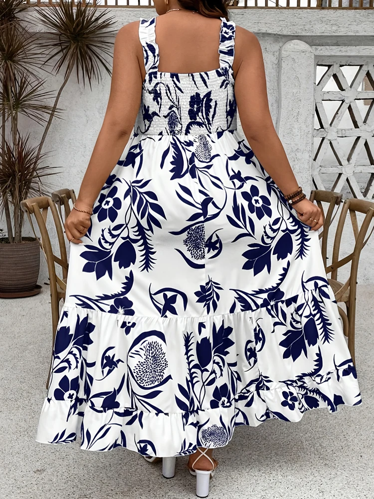 Plus Size 2025 Summer New Holiday Floral Halter Dress with Ruffle Hem and Gathered Bust Plus Size Dress Polyester