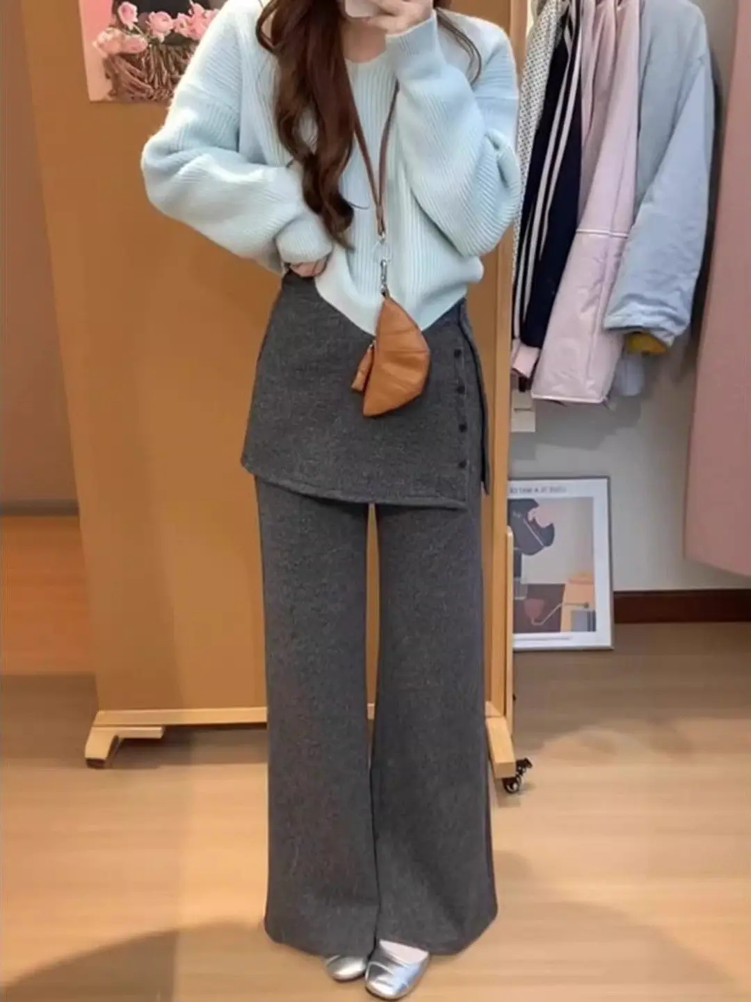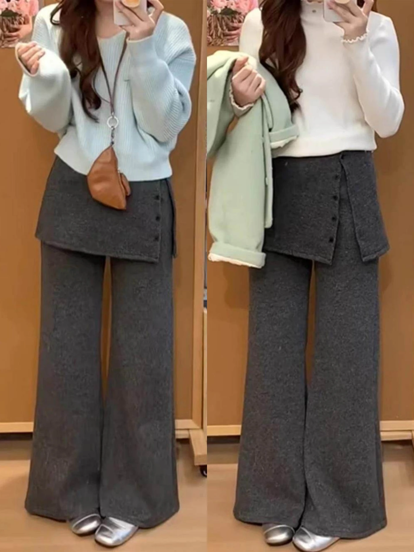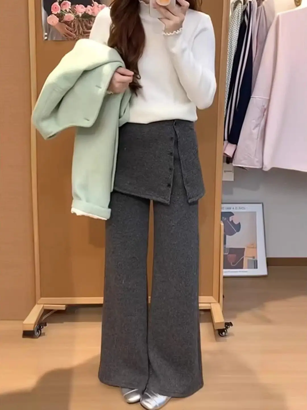 Plus Size ay Woolen Thiened Removable Wide Leg Pants Women’s Fake Two-Piece High Waist Lazy Design Casual Pants Autumn Winter