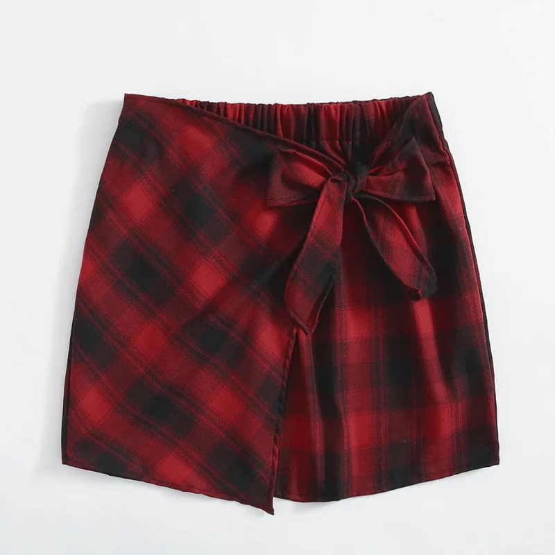 Plus Size Elastic Waist Summer Spring Casual Bandage Plaid Skirt Women Bow Front Vintage Checked Mini Skirt Plus Size Bottoms