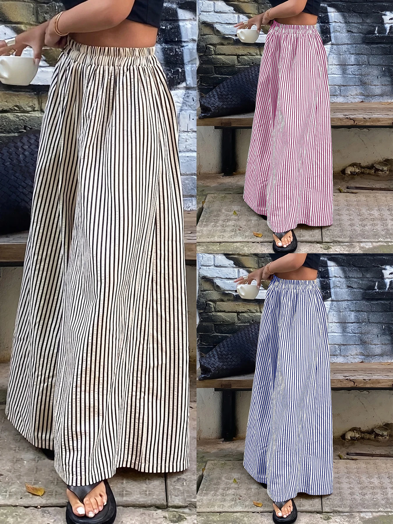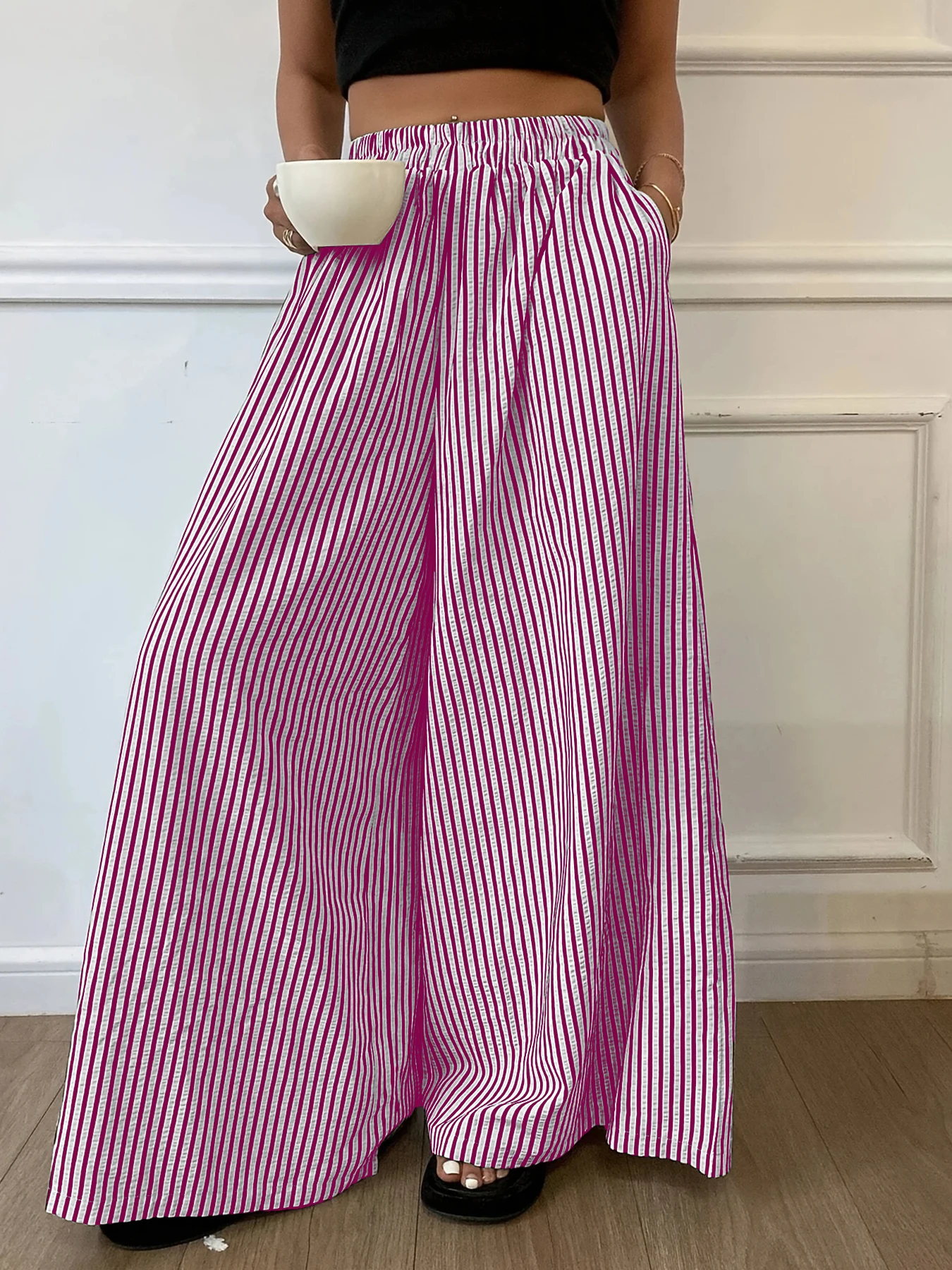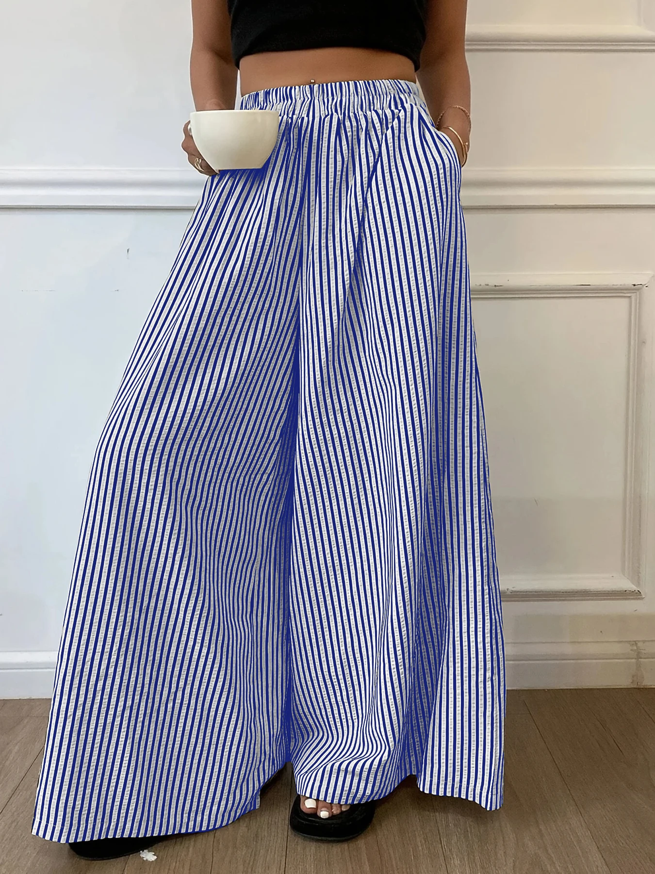 Plus size Europe and the United States cross-border spring and summer striped pocket elasticated waist wide-leg trous