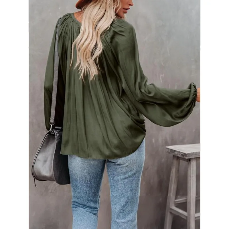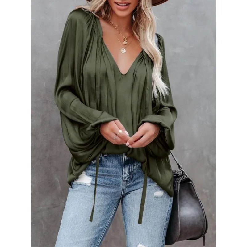 Plus Size Fashion Long Sleeve V Neck Office Casual Shirt Women Elegant Simple Loose Blouse Ladies Pleated Solid Color Top