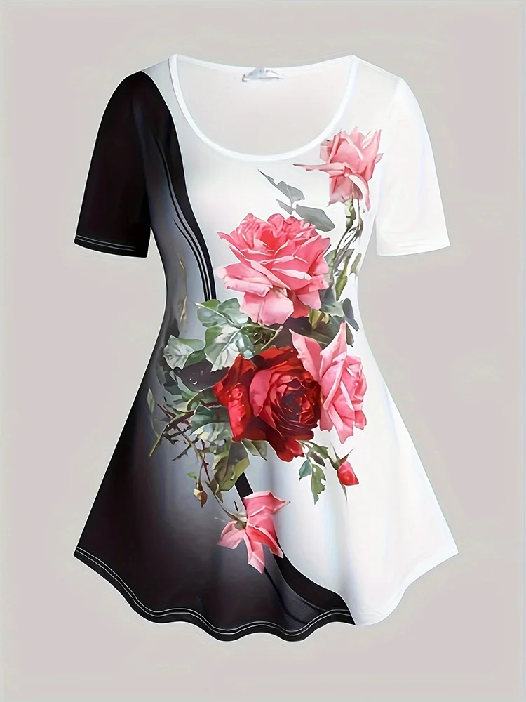 Plus Size Large Casual Set, Summer New Contrasting Rose Flower Print Oversized Round Neck T-Shirt Pants, Slim Fit Two-Piece Set