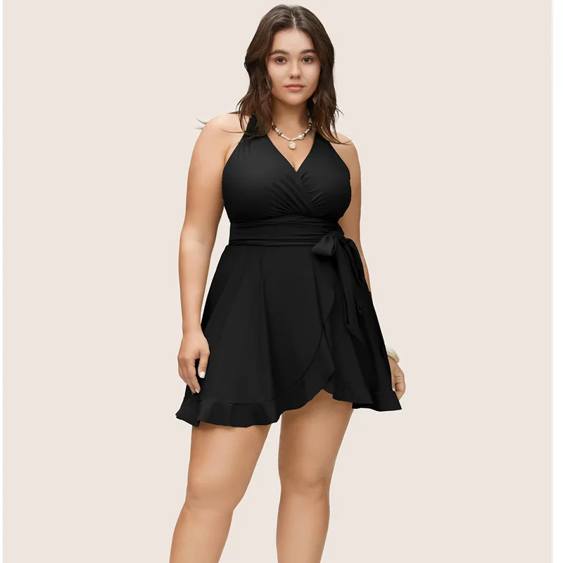 Plus Size One Piece Swimsuit Women Solid Swimwear Tummy Control Bathing Suits Bandage Cover Up Swim Dress