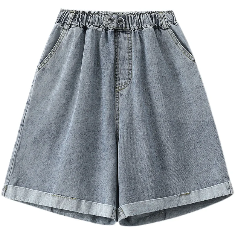 Plus Size Shorts For Women 2024 Summer New Arrivals High Elastic Waist Crimping Wide Leg Loose Streetwear Blue Jeans Shorts