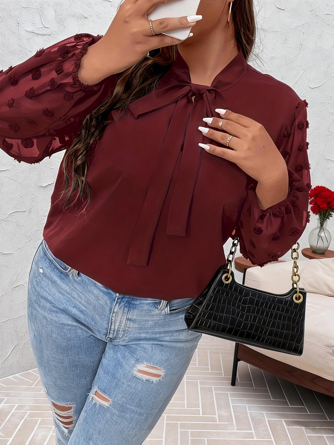 Plus Size Spring Autumn Women Elegant Bow Tie Neck Shirt Office Lady Fashion Solid Curve Clothing Casual Long Sleeve Tops
