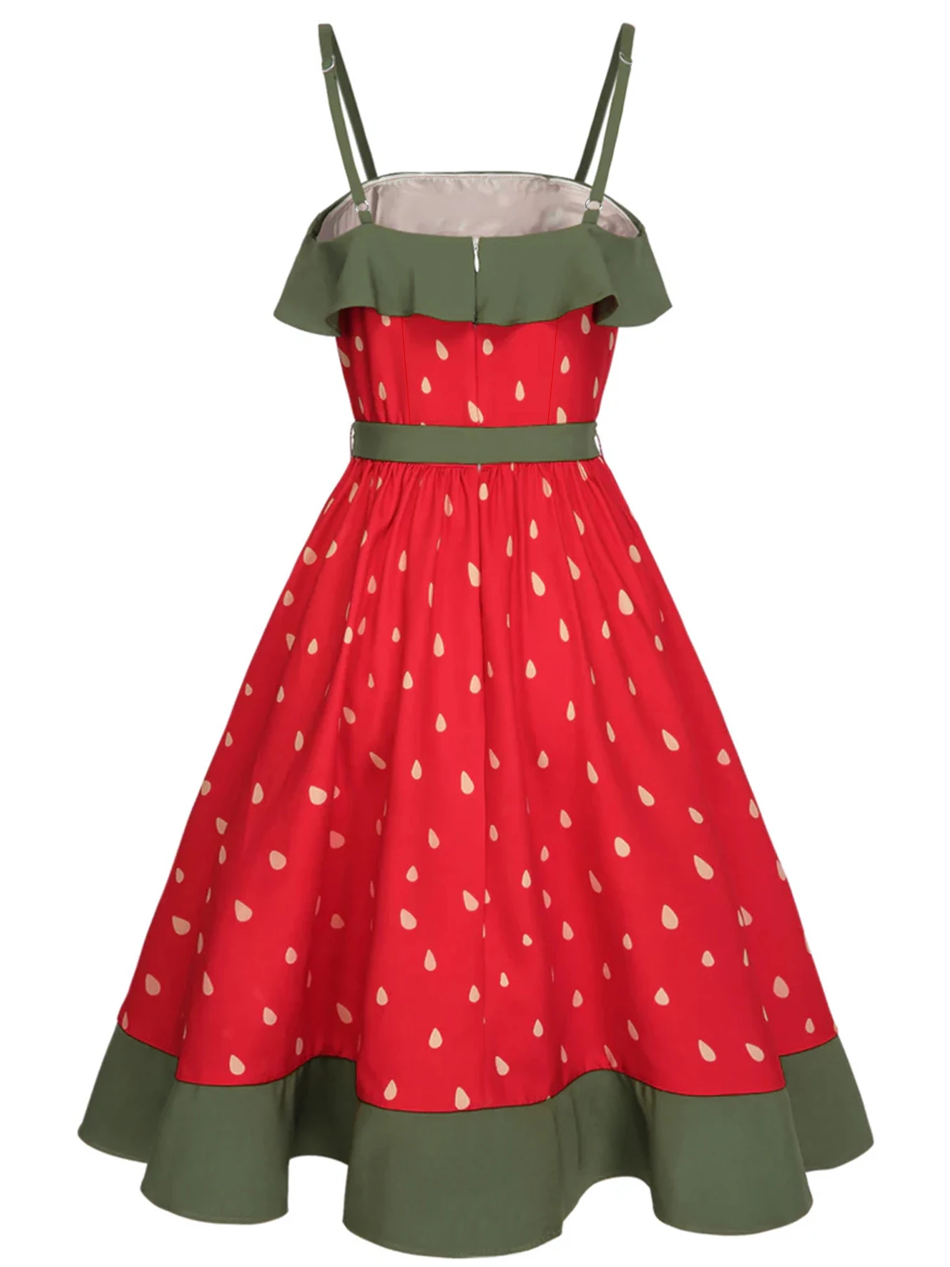 Plus Size Strawberry Print Dress Women’s Red Strapless Sundress Green Lace Trim Summer Dress Free Shipping