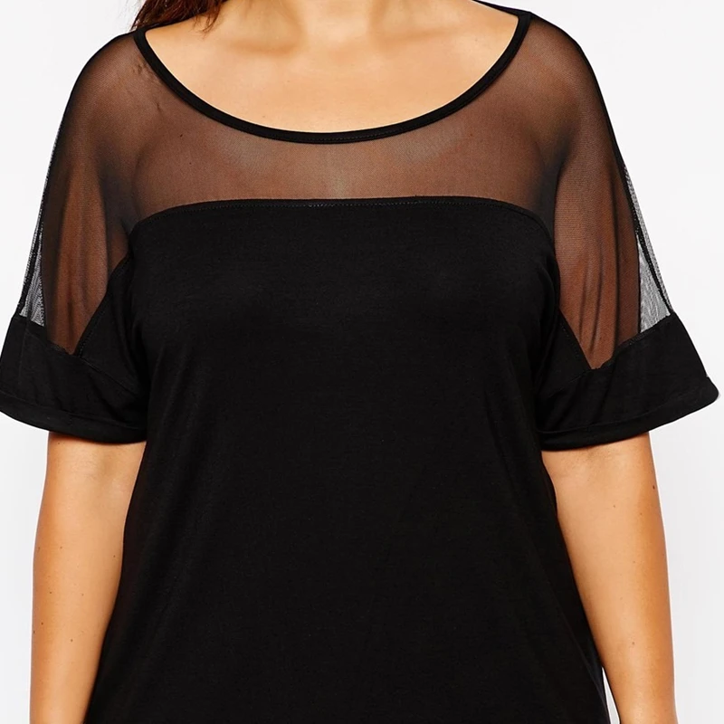 Plus Size Summer Casual Top Women Mesh Patchwork Short Sleeve Black Loose T-shirt Tee Female Plus Size Women Clothing 6XL 7XL 8X
