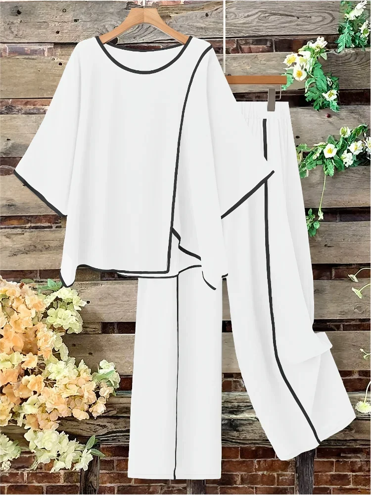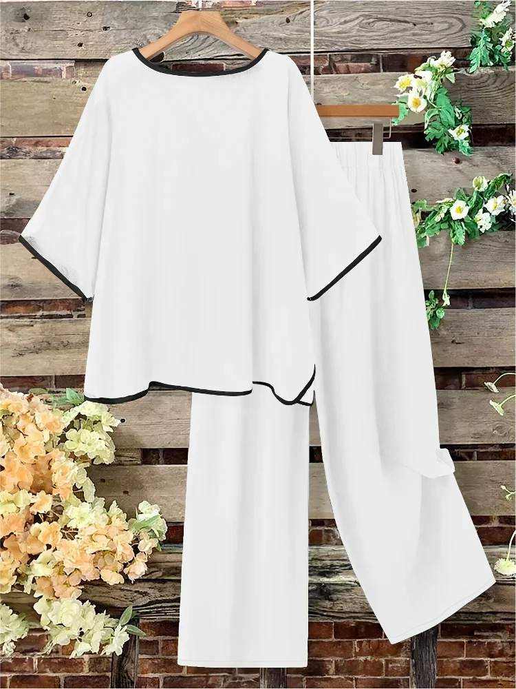 Plus Size Women Casual Fashion Set Loose Comfortable Open Split Half Sleeve Top Wide Pants Long Pant Two Piece Outfit Pajama Set