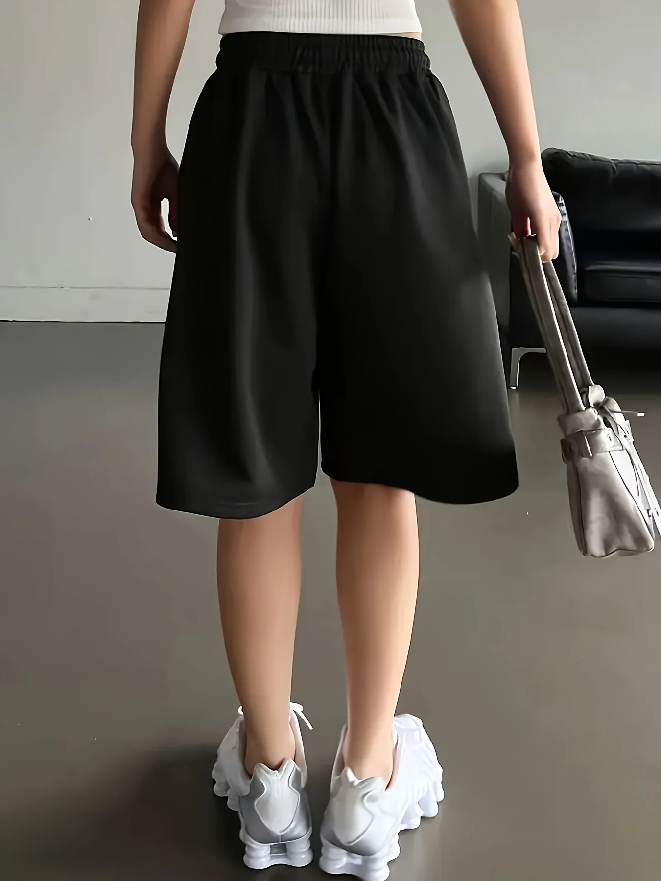 Plus-size women’s casual style solid color sweatshirt and shorts with drawstring waist and pockets for everyday casual wear.