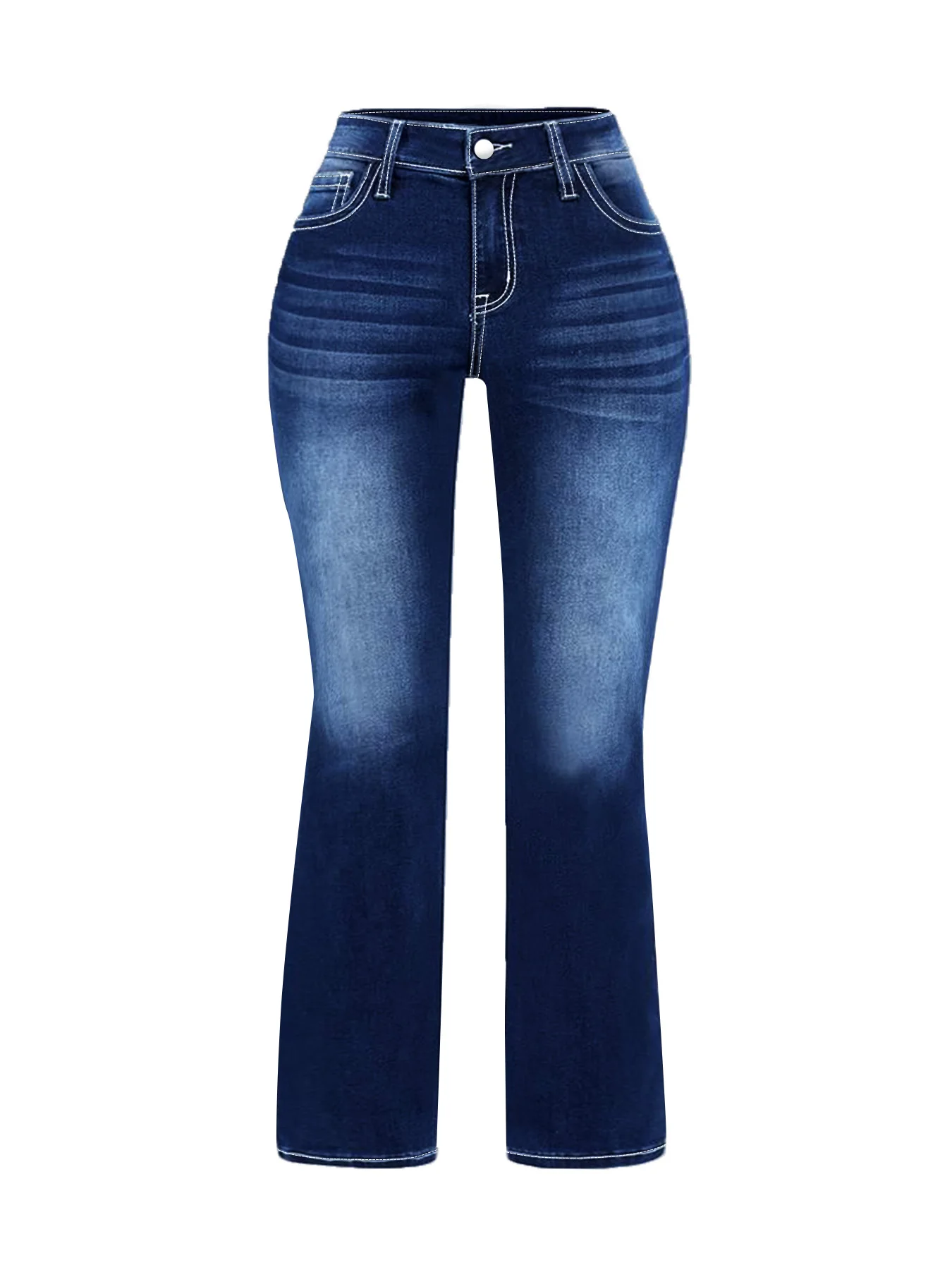 Plus size women’s high waisted flared pants, retro embroidered back pocket design, deep blue comfortable women’s jeans