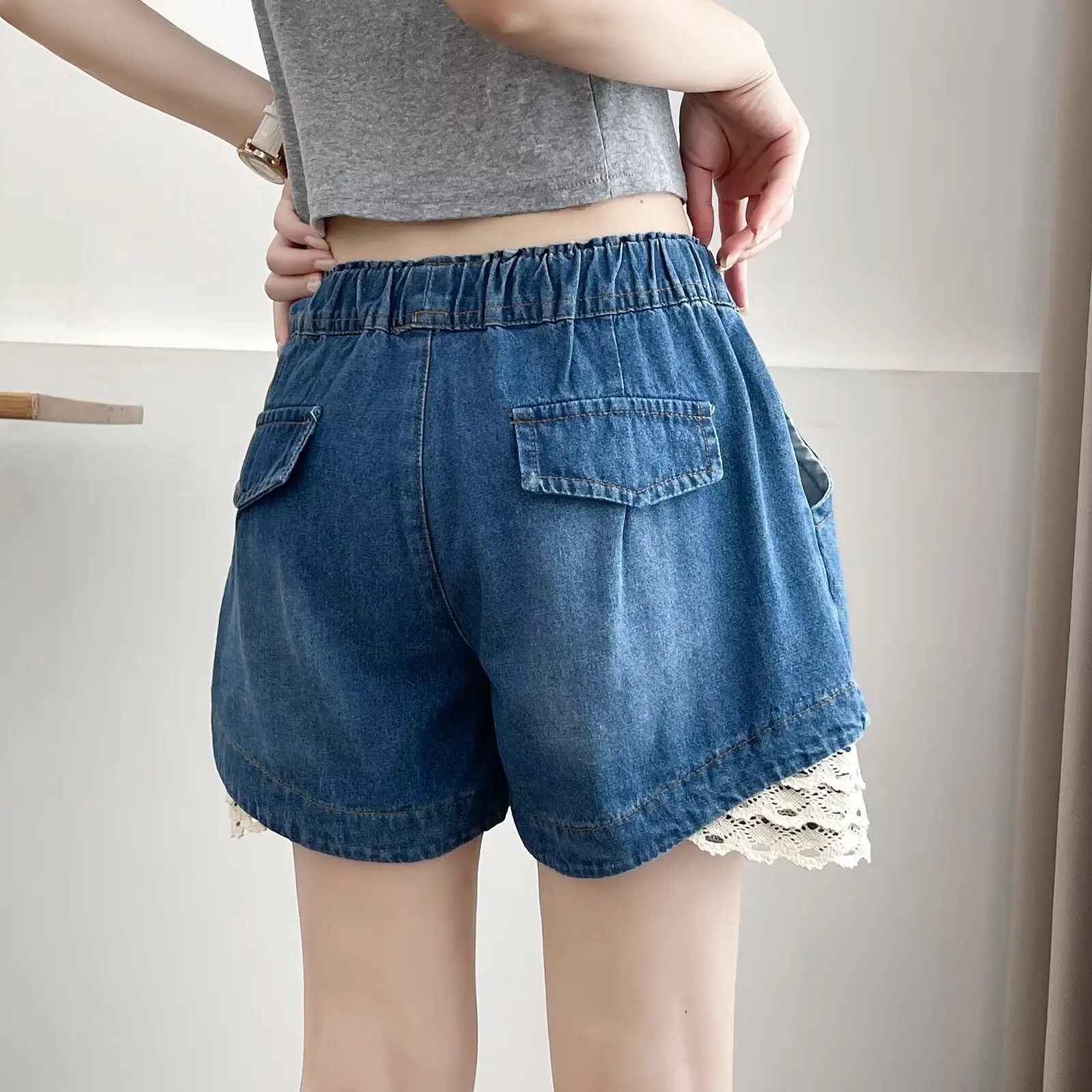 Plus Size Women’s Jeans 100kg Fashion Lace For Edging Drawstring Elastic Waist Denim Shorts Wide Leg Hot Pants Summer 25007
