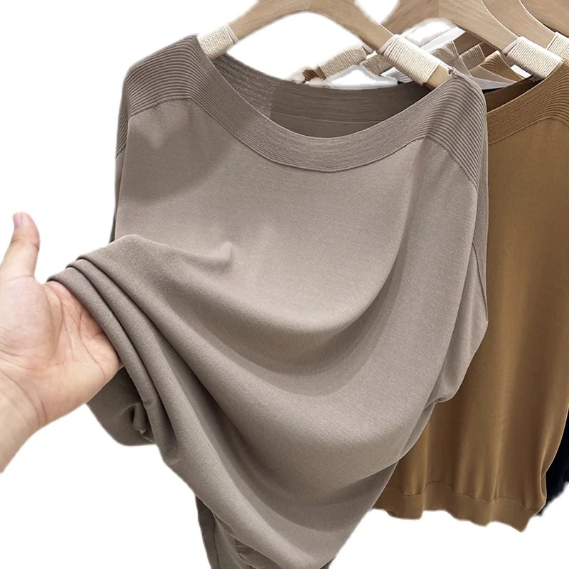 plus Size Women’s One oulder Pure Color Ice Silk Knitted ort Sve T-irt Summer Loose Slim Batwing Sve Faionable Top