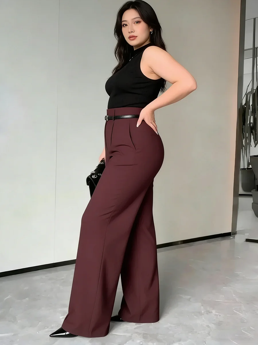 Plus Size Women’s Pants High Waist Belted Solid Pintuck Wide Leg Bottoms Elegant Spring Summer Office Stretchy Bottoms