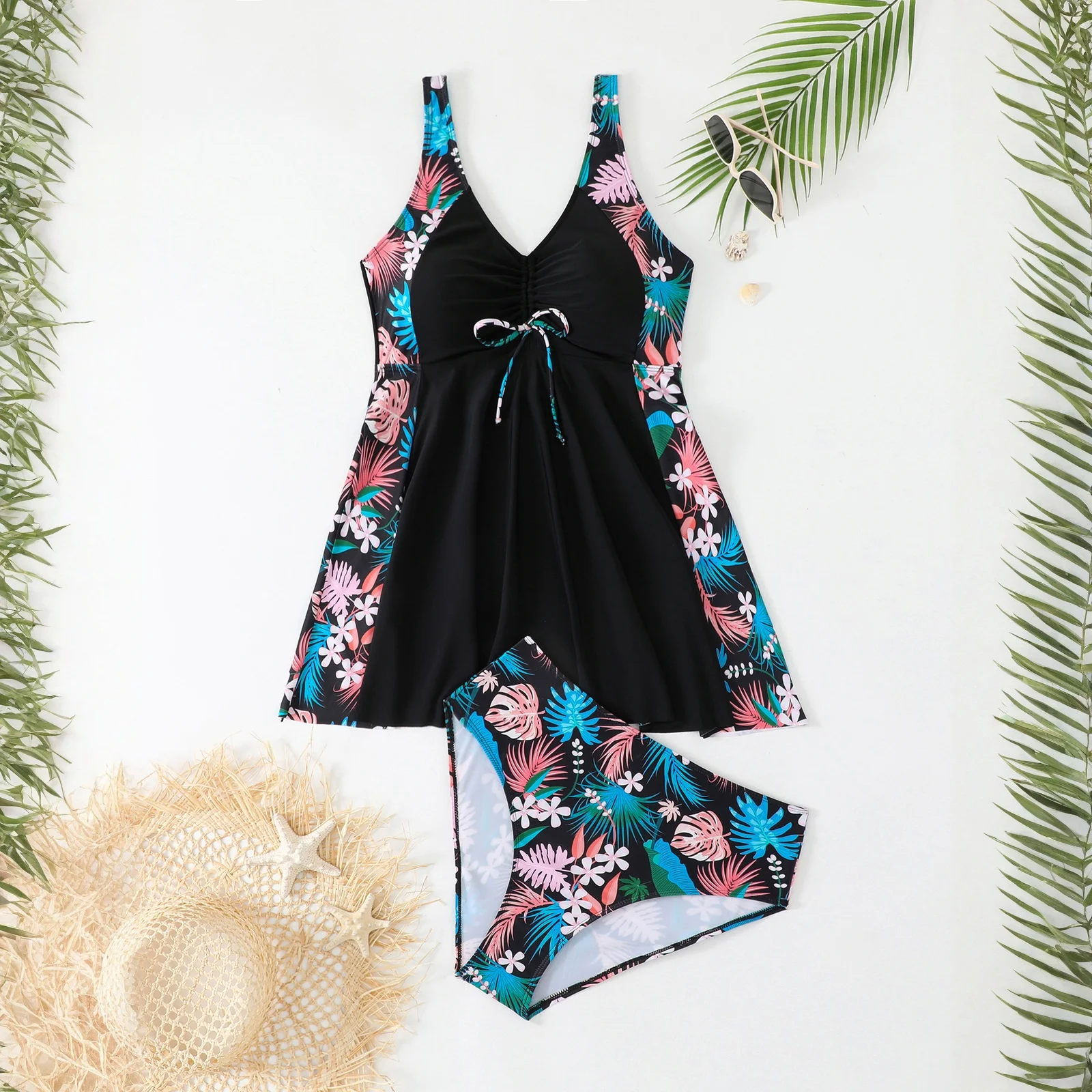 Plus Size Women’s Two-piece Swimsuit, Conservative Split Skirt Swimsuits (Suspender Swimsuit + Low-Rise Triangle Underwear)