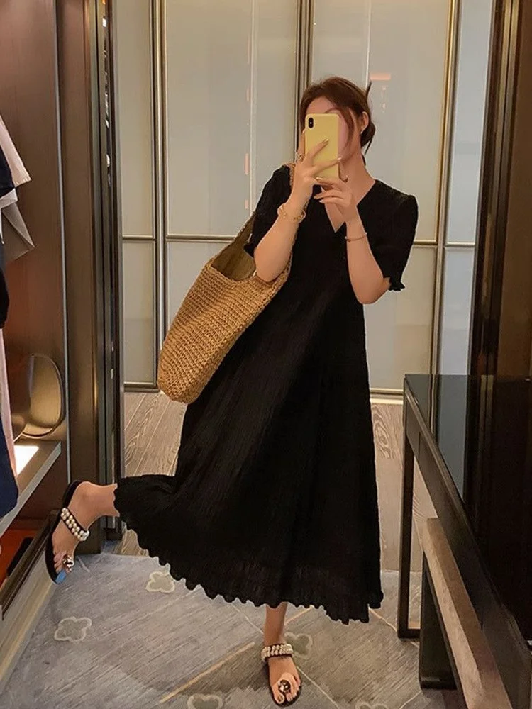 plus Size Women’s V-Ne Dr Summer Loose Meat Concealing Pleated A-Line Long Skirt Casual Korean Sle Fro for Pear aped