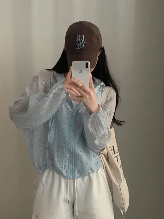 Polka Dot Printed Long Sve Women’s Summer Fre Sle Anti UV Hat Jaet Korean Loose Fit Bubble Sve Zipper Closure o…