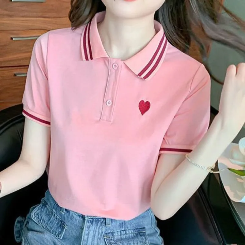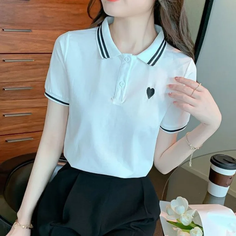 Polo Neck Shirt for Women100℅ Cotton Woman T Embroidery Button Graphic Slim Korean Clothing Trend 2025 Youthful Elegant Style