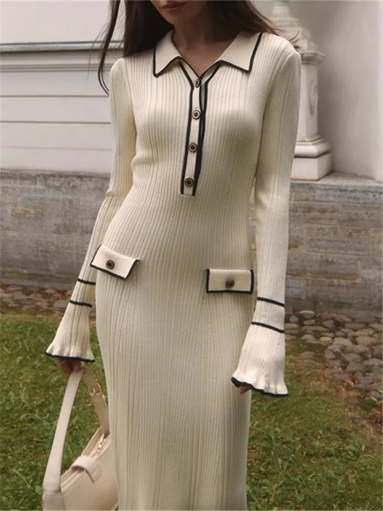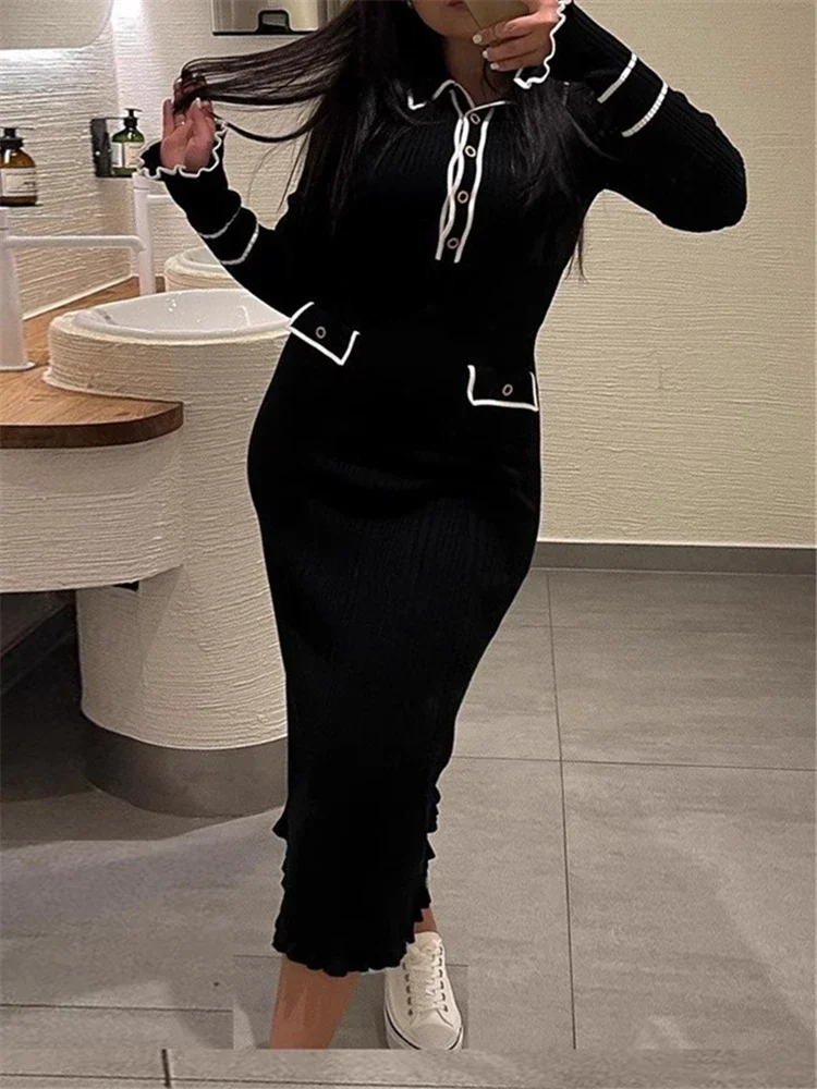 REALEFT Autumn Winter Elegant Knitted Long Ruffles Dressres 2025 New High Waist Buttons Turn-down Collar Sweater Dresses Female