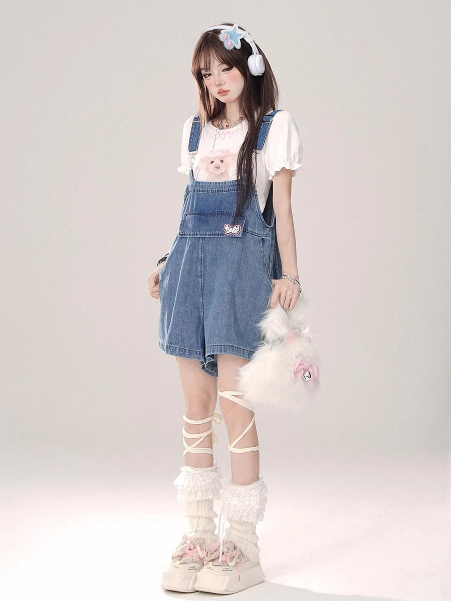 REDDACHiC Denim Blue Bunny Ears Rompers Women Star Rivets Sleeveless Wide Leg Solid Casual Overall Shorts Jumpsuit Streetwear