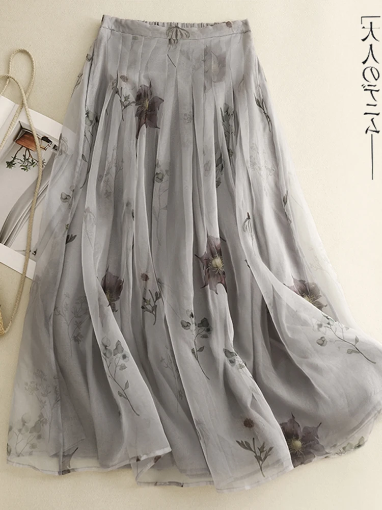 Retro Cotton Linen Double Layer A-Line Skirt High Waist Pleated Draped Ele Summer Long Skirts for plus Size Women