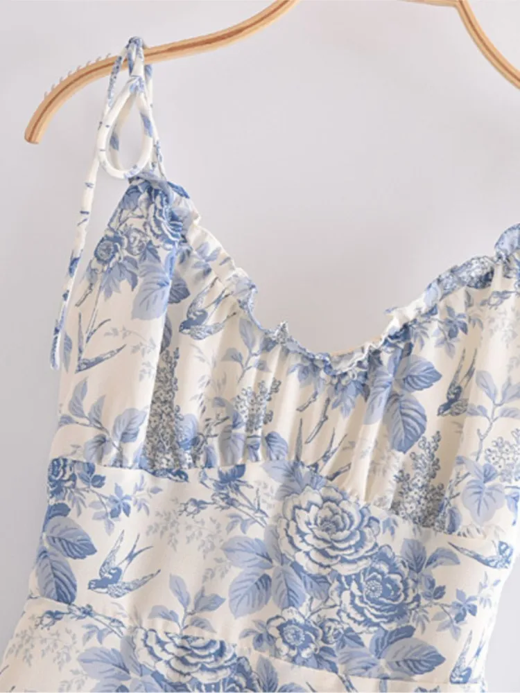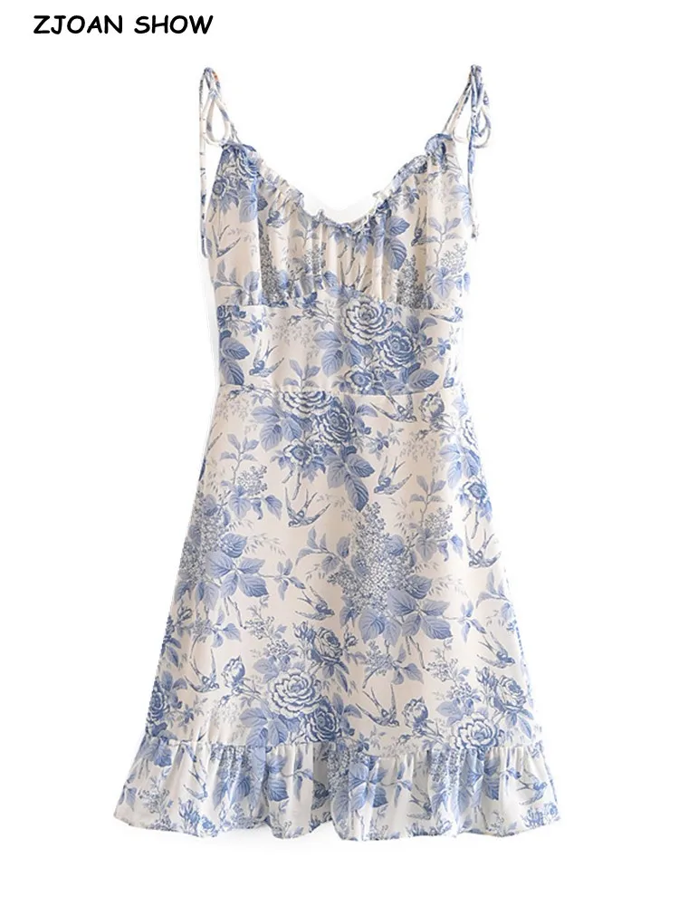 Retro French style Summer Blue White Floral Swallow Print Ruched Bandage Strap Mini Dress Sexy Ruffles Hem Lacing Up Sling Robe