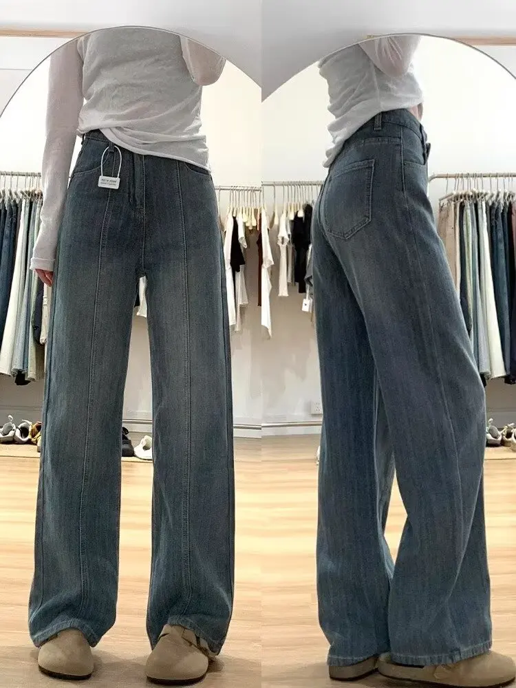 Retro Texture Wide Leg Denim Pants Loose Drapey Straight Long Trousers for Women High Waist Zipper Closure Casual Sle