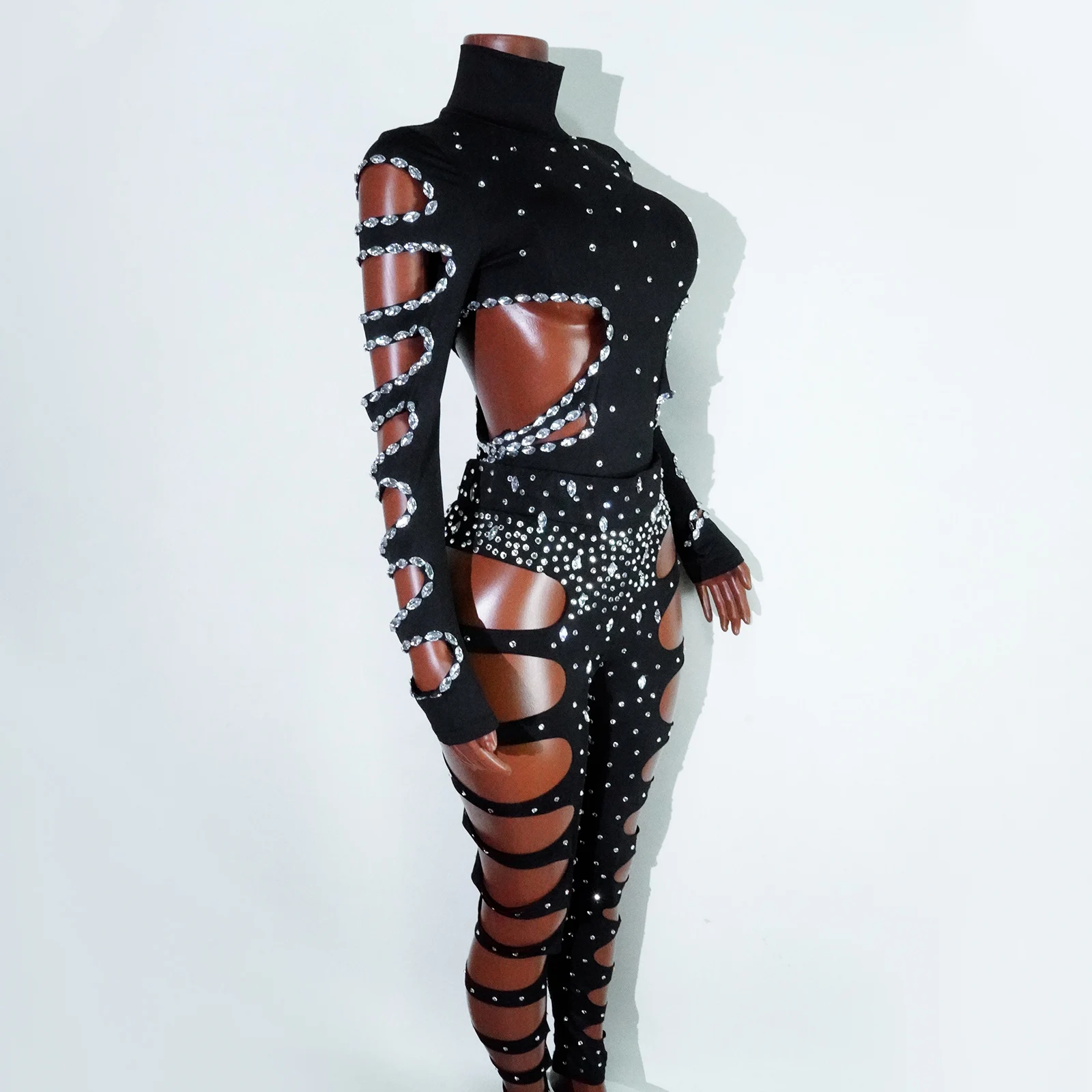 rhinestHollow Out Sexy Black Women Bodysuit pants Sets Long Sleeve Turtleneck Bodysuits Clubwear Costumes Stars Hot Singer Stage