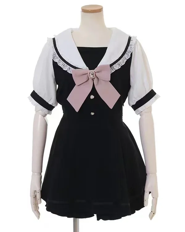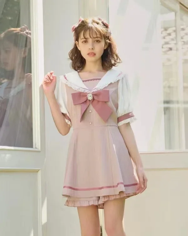 Rojita Japanese Sailor Collar Long Sleeve Dress for Women Spring Summer Sweet Lolita Bow Dress Shorts Suit Women’s Two-Piece Set