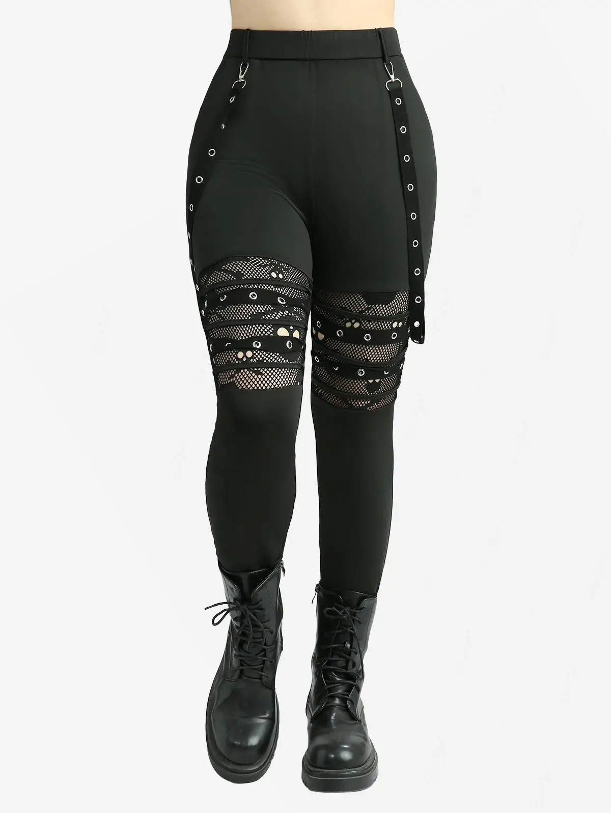 ROSEGAL Plus Size Leggings Women Casual Black Trousers Skull Hollow Out Fish Net Patchwork Grommets Straps Pencil Pants Mujer