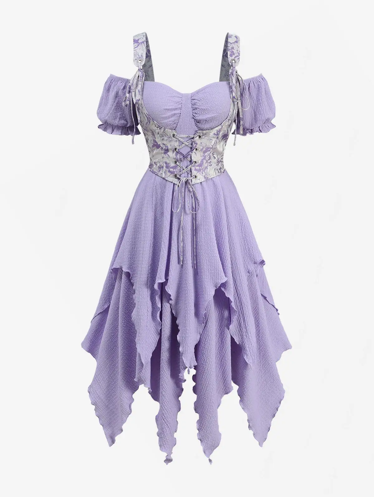 ROSEGAL Plus Size Women’s Dresses Flower Printed Lace Up Corset Handkerchief Textured 2 in 1 Dress Asymmetrical Vestidos 5XL
