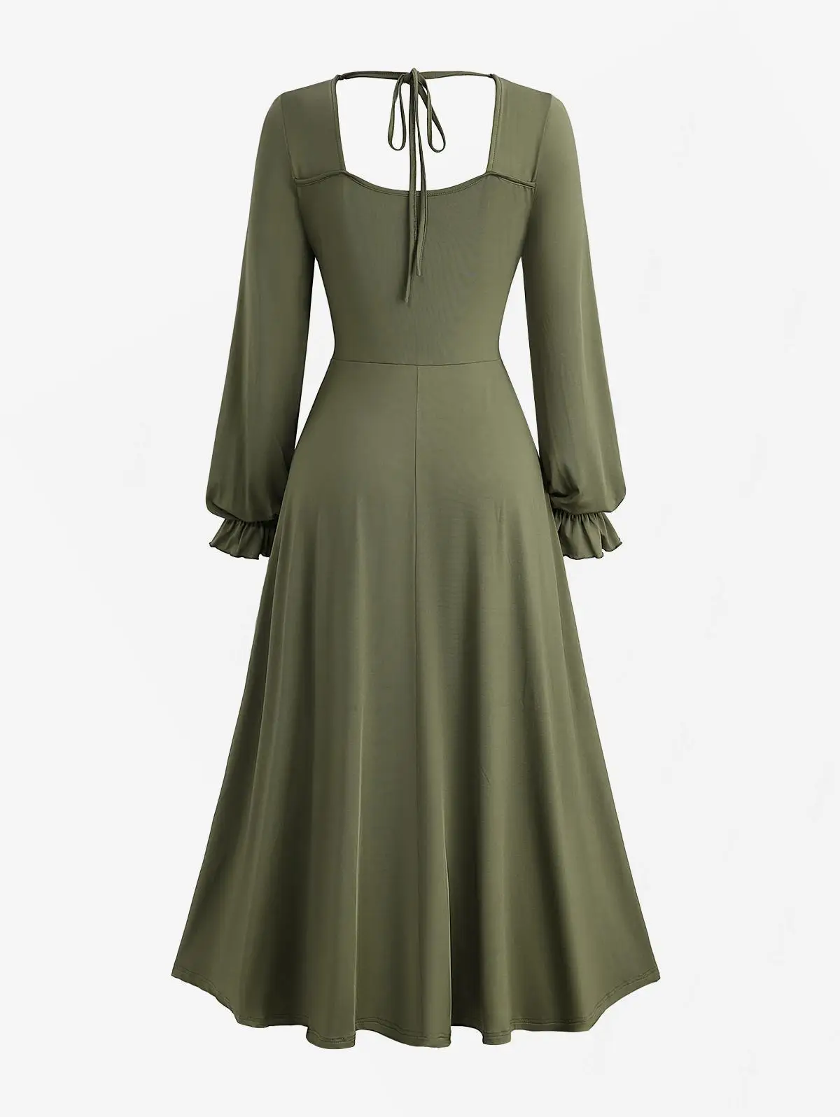 ROSEGAL Plus Size Women’s Lace Up Ruched Ruffles Poet Sleeves Dress New Spring Autumn Casual Midi Solid Color Dresses