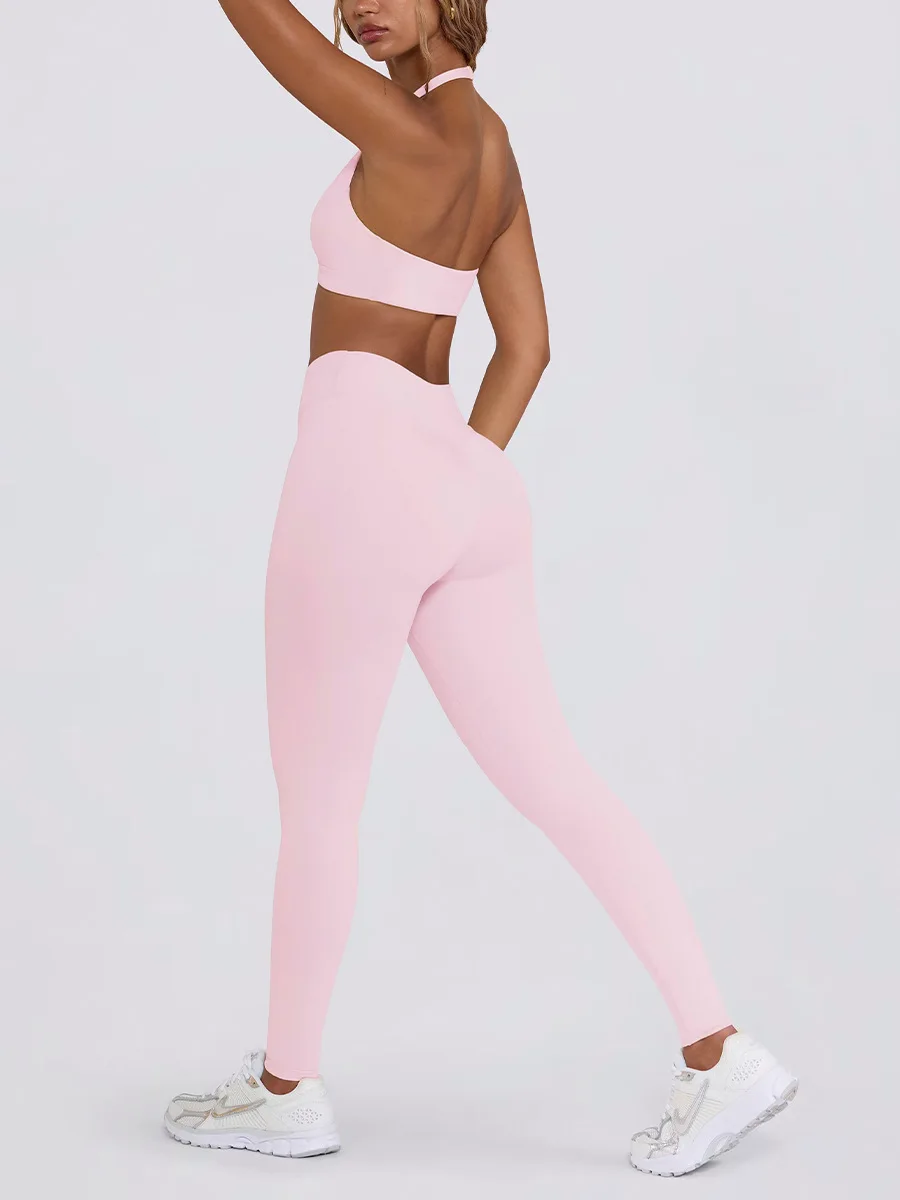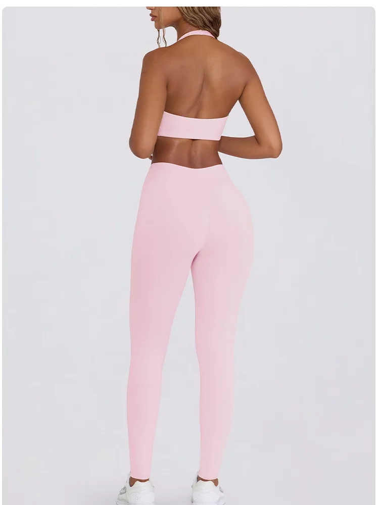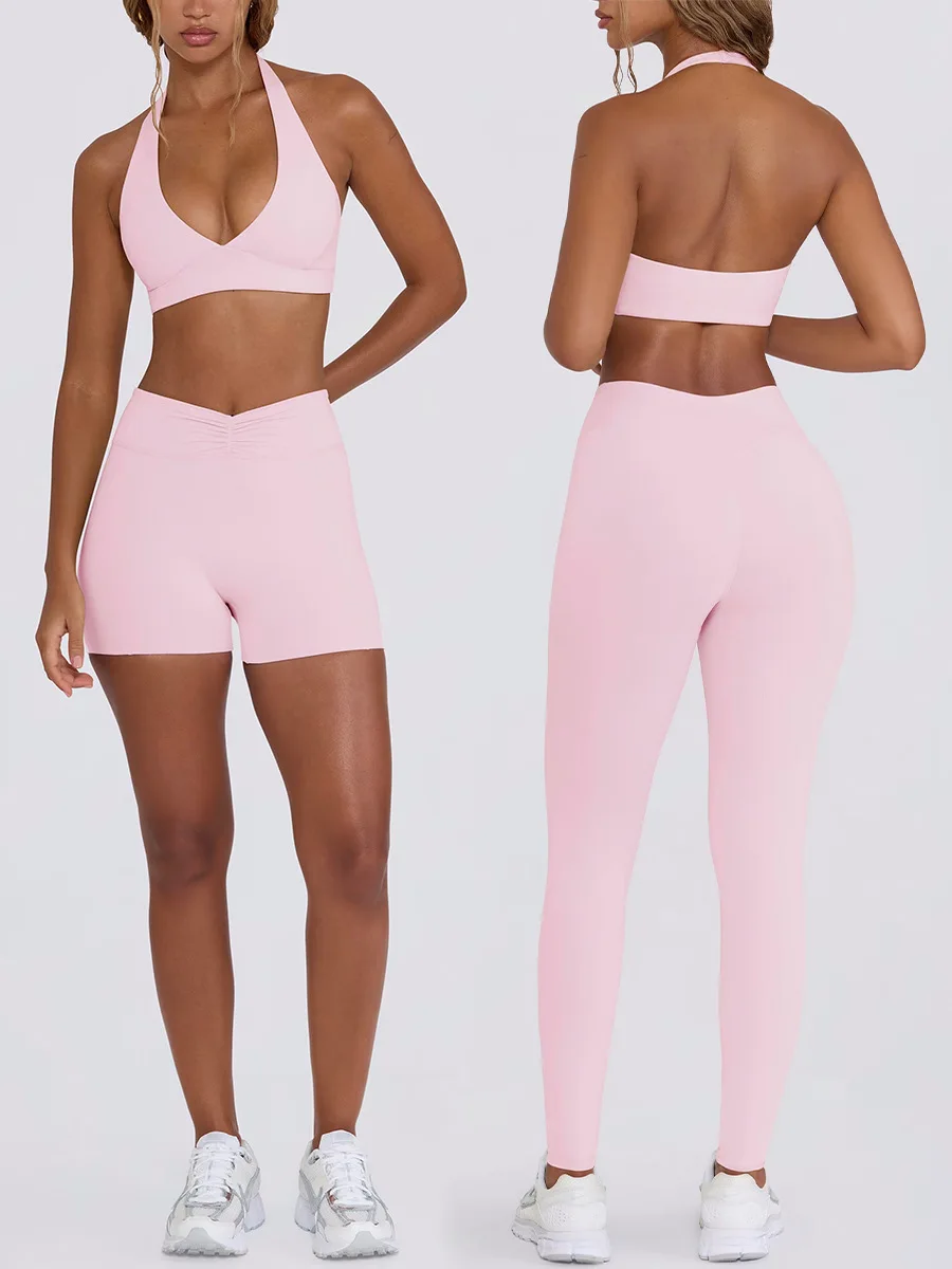 SEEKSUC Women’s Yoga Suits Quick Drying Leggings Gym Shorts Nude Hanging Neck Bra Running Gym Exercise Sets