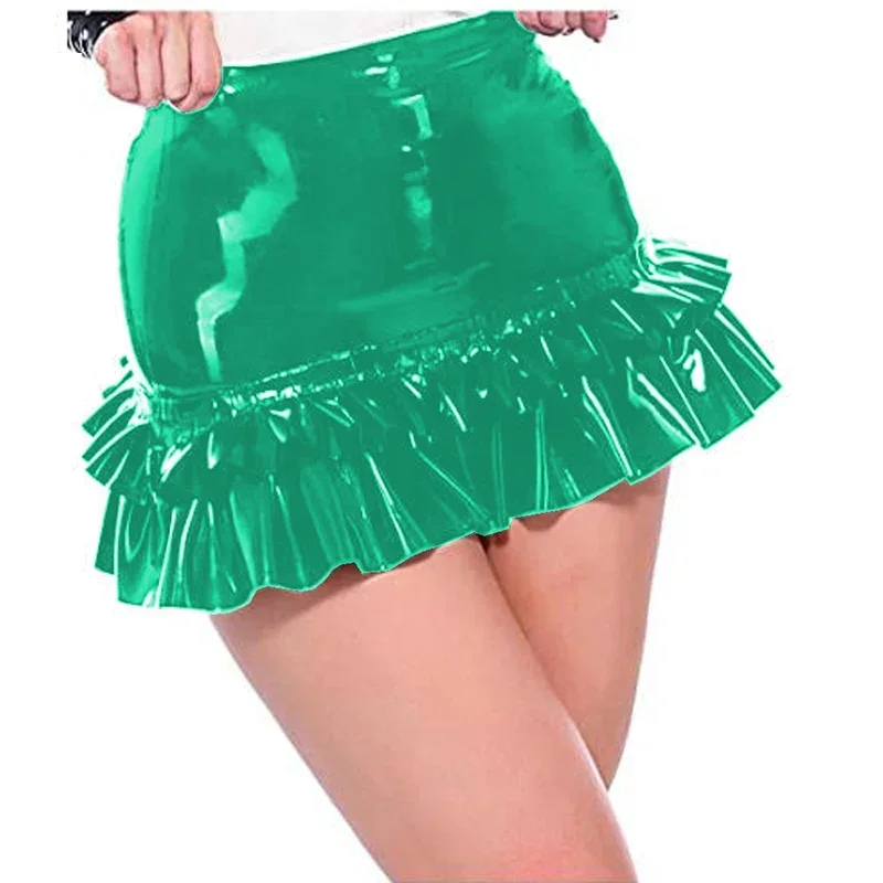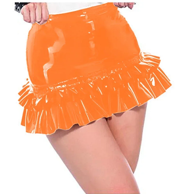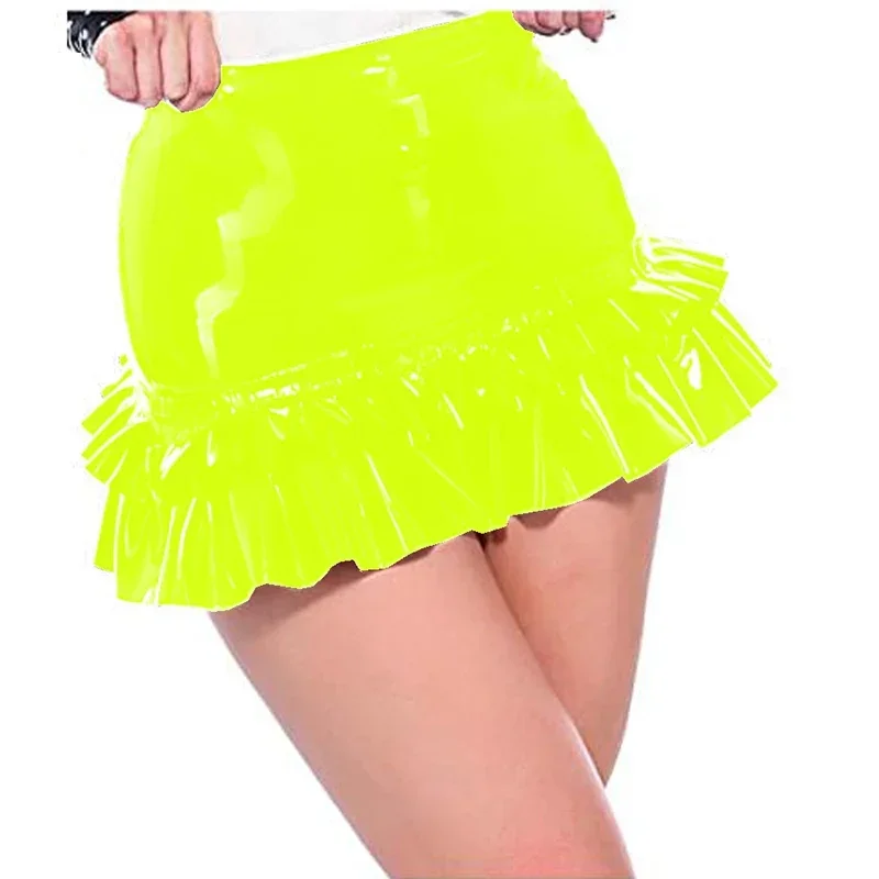 Sexy Girl Mini Skirt Glossy PVC Leather High Waist Ruffled Pencil Skirt Wetlook Women Plus Size Skirts Office Lady Bodycon Skirt