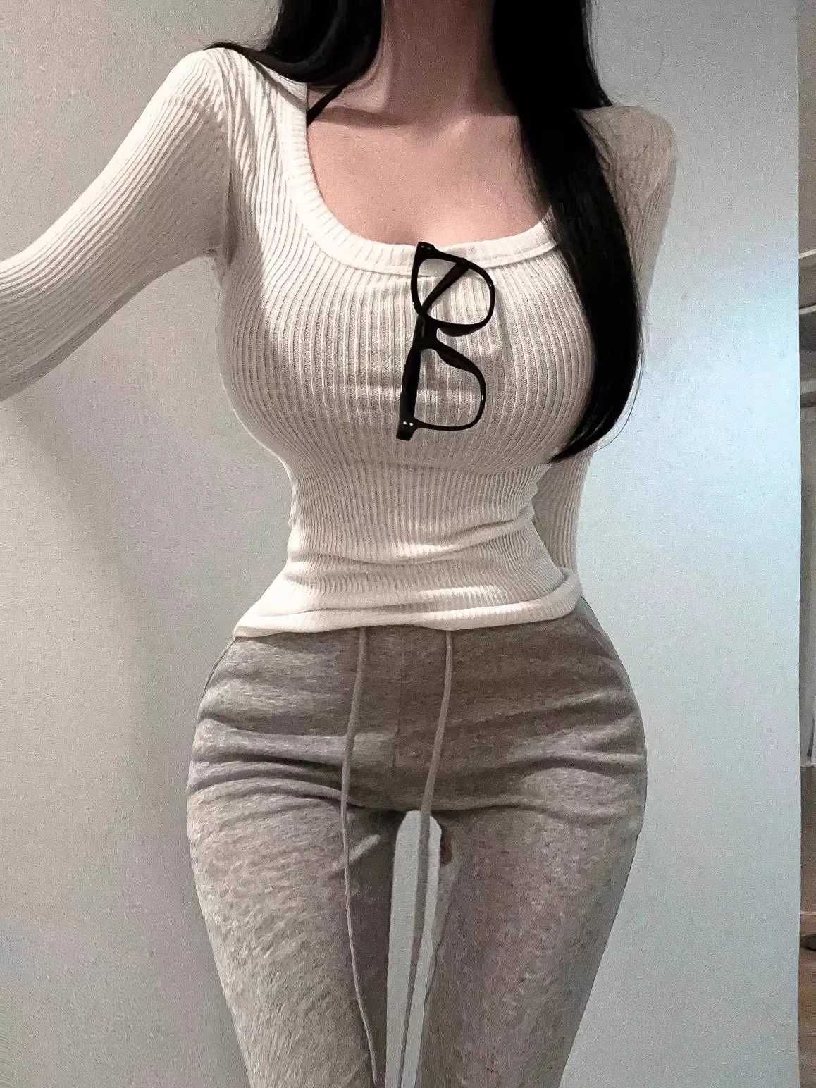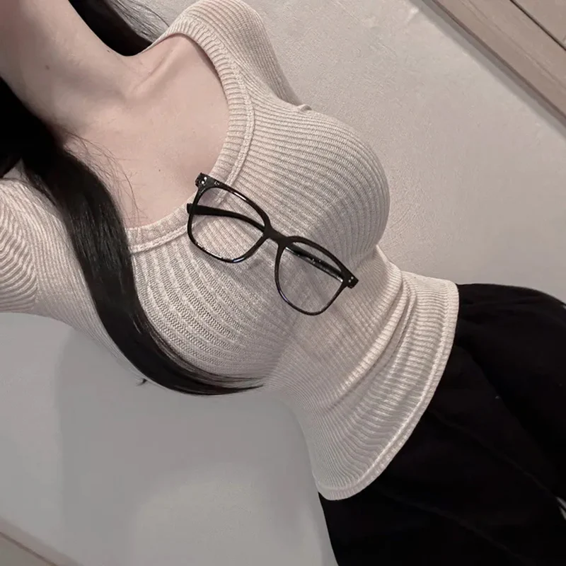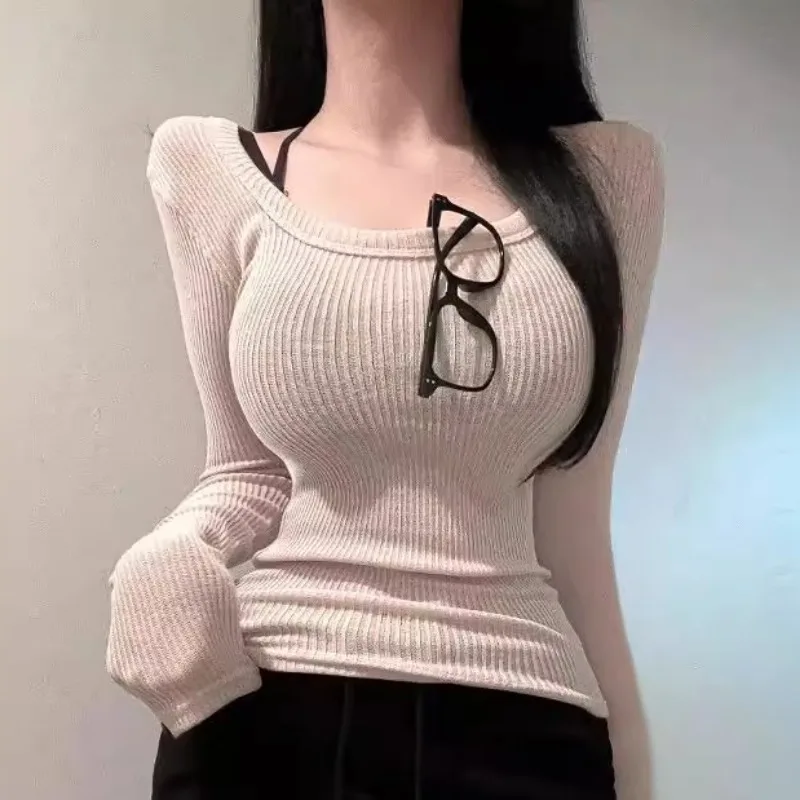 Sexy Long Sve round Ne T-irt Women’s Comfortable Slim Fit Knitted Top Korean Sle Pure Color Commute Faion Autumn Wear