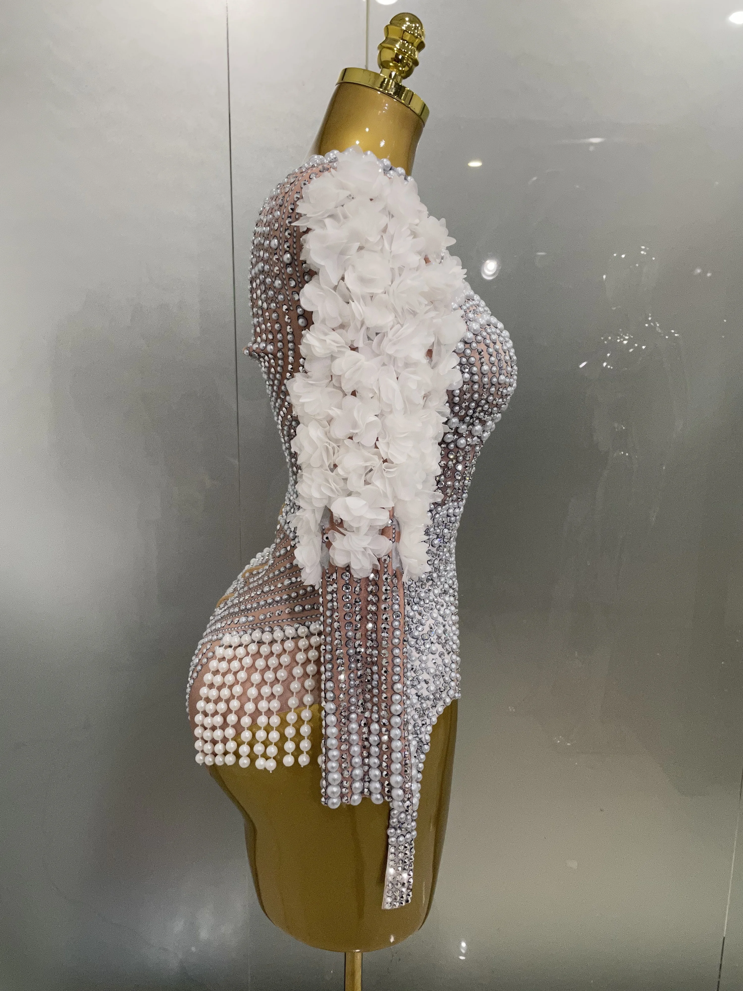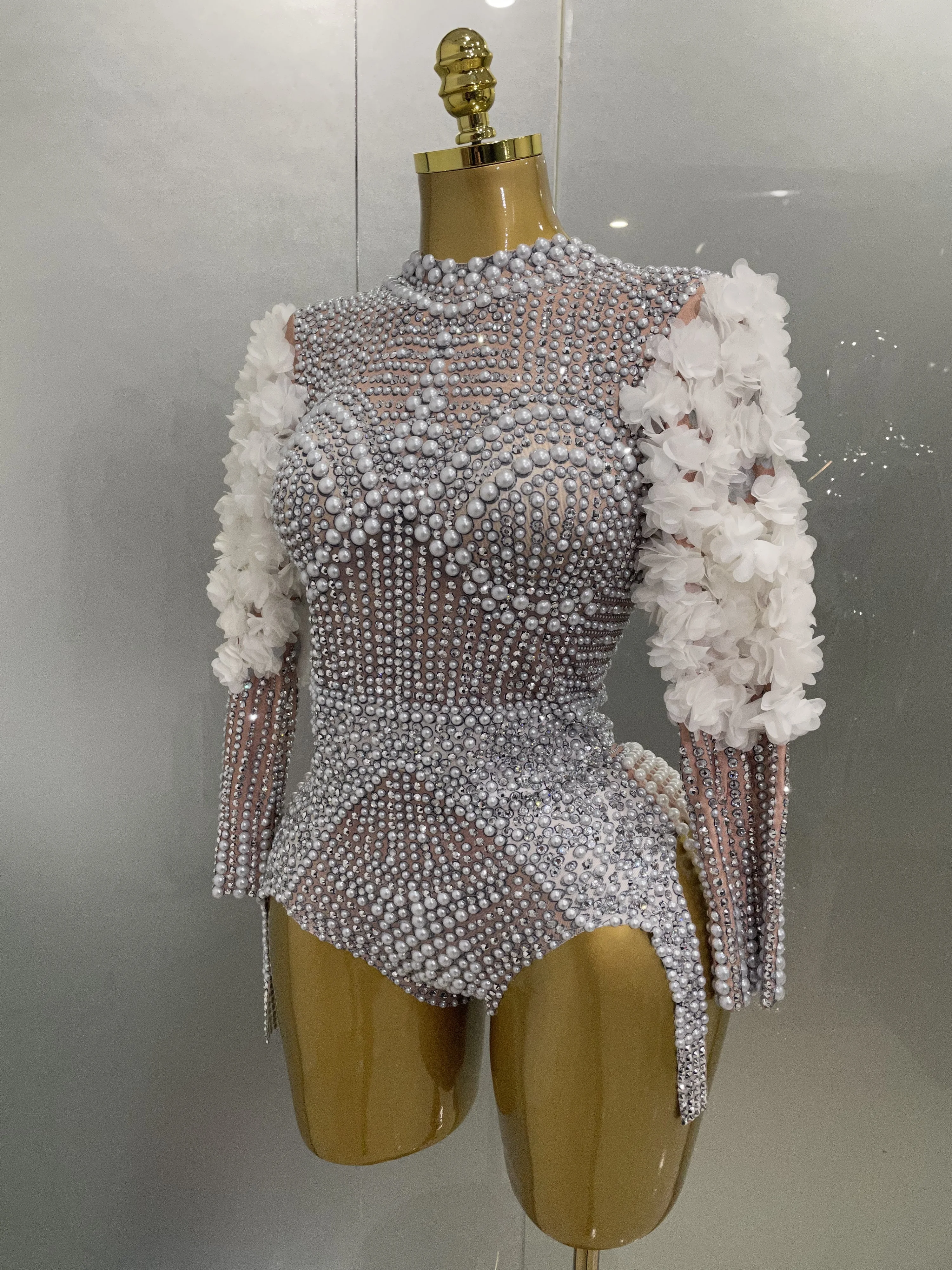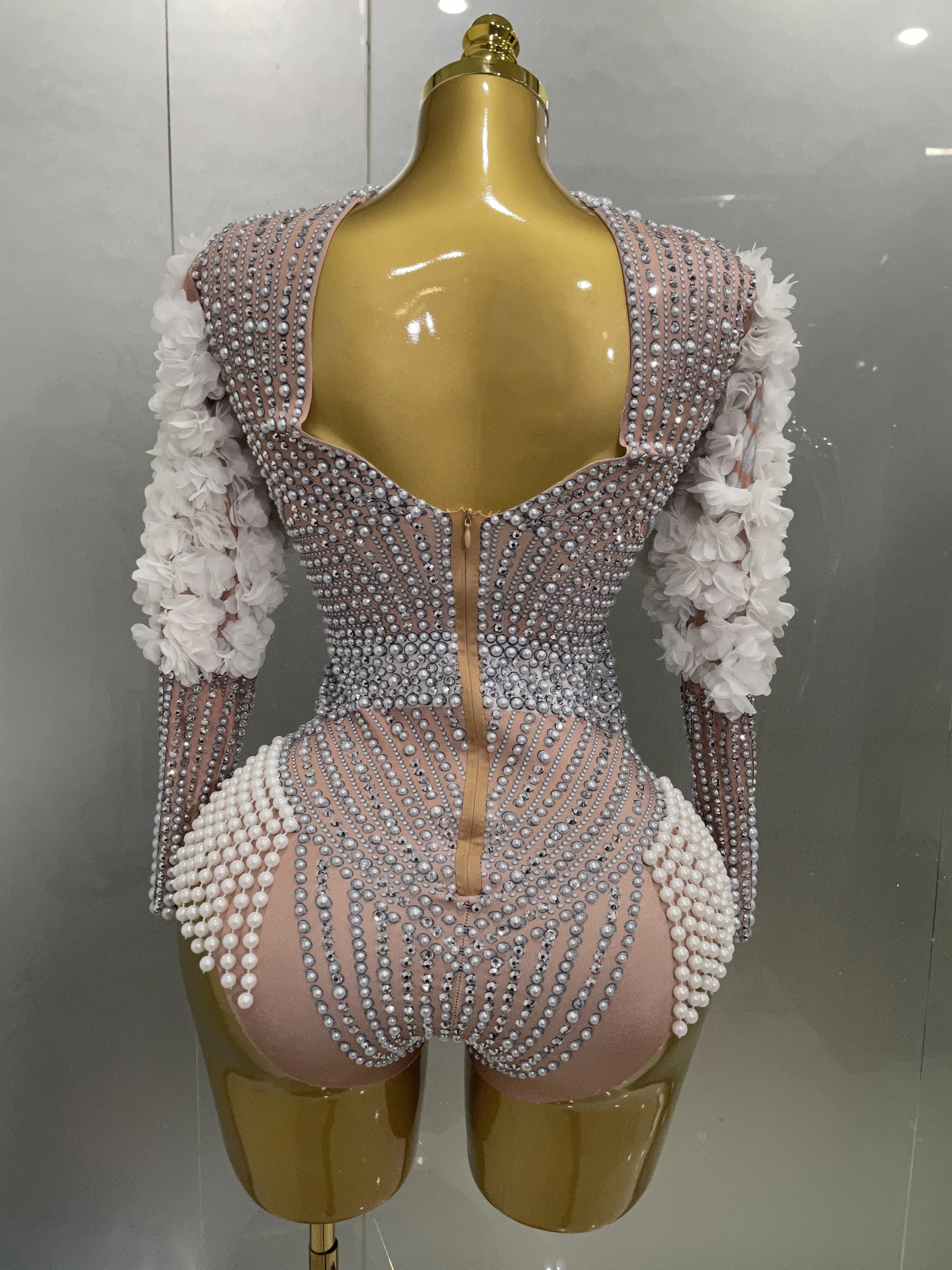 Sexy Luxury Sparkle Diamond Pearls Flower Bodysuits 2025 Women Birthday Party Leotard Dancer Nightclub Performance Stage Outfit