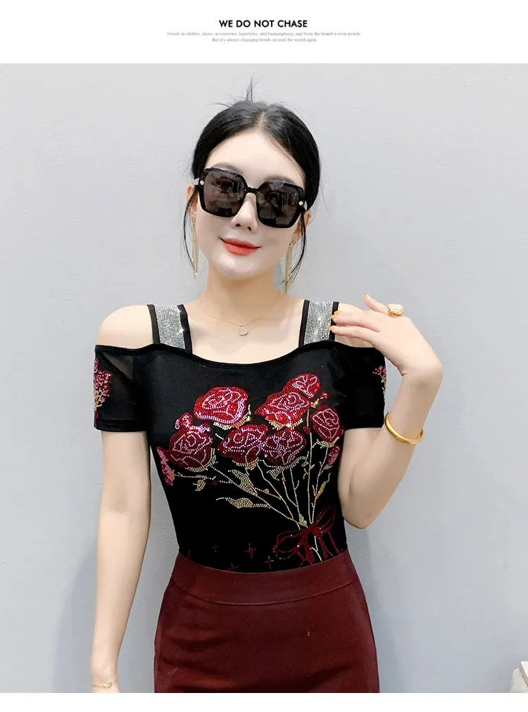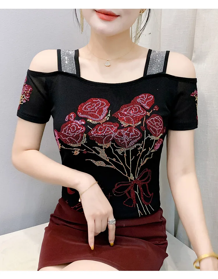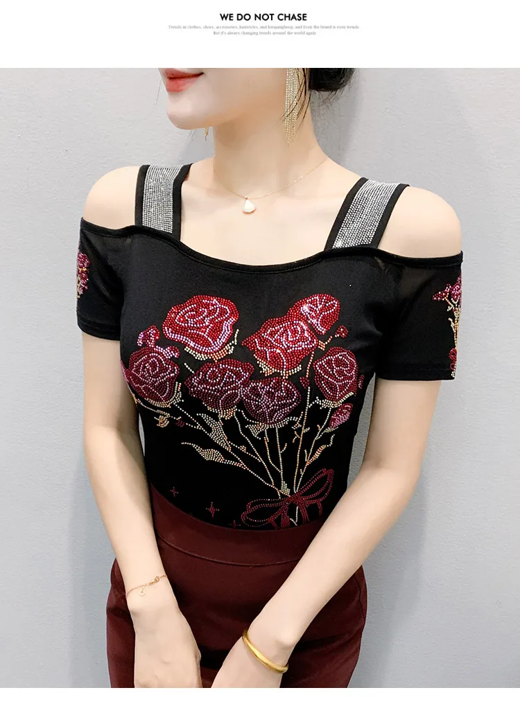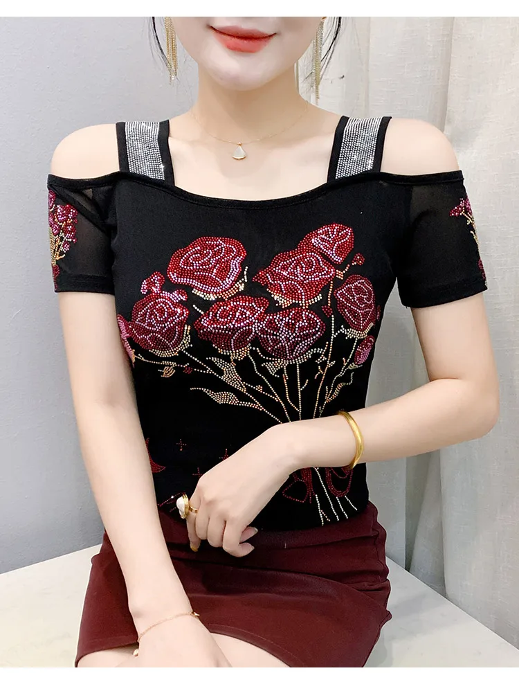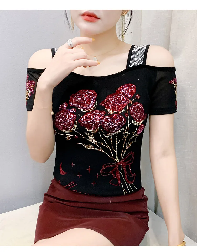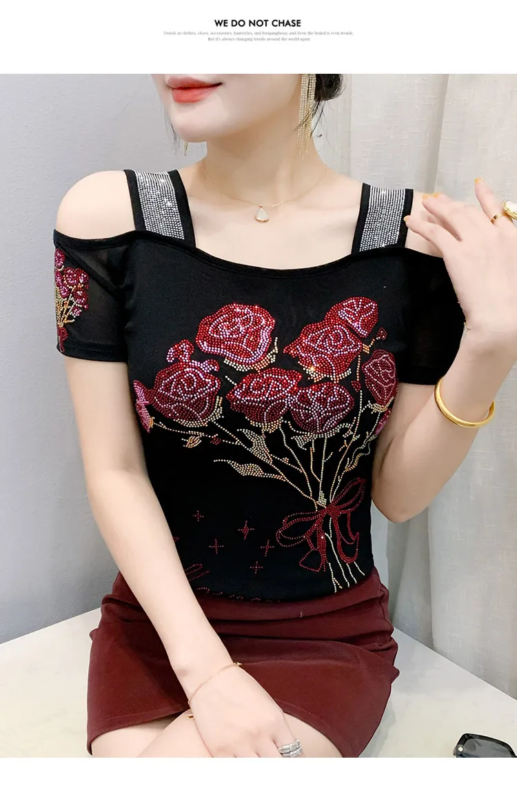 Sexy Off Shoulder T Shirt For Women Luxury Flower Diamonds Short Sleeve Tee Summer Fashion Womens Mesh Tee Shirts Top