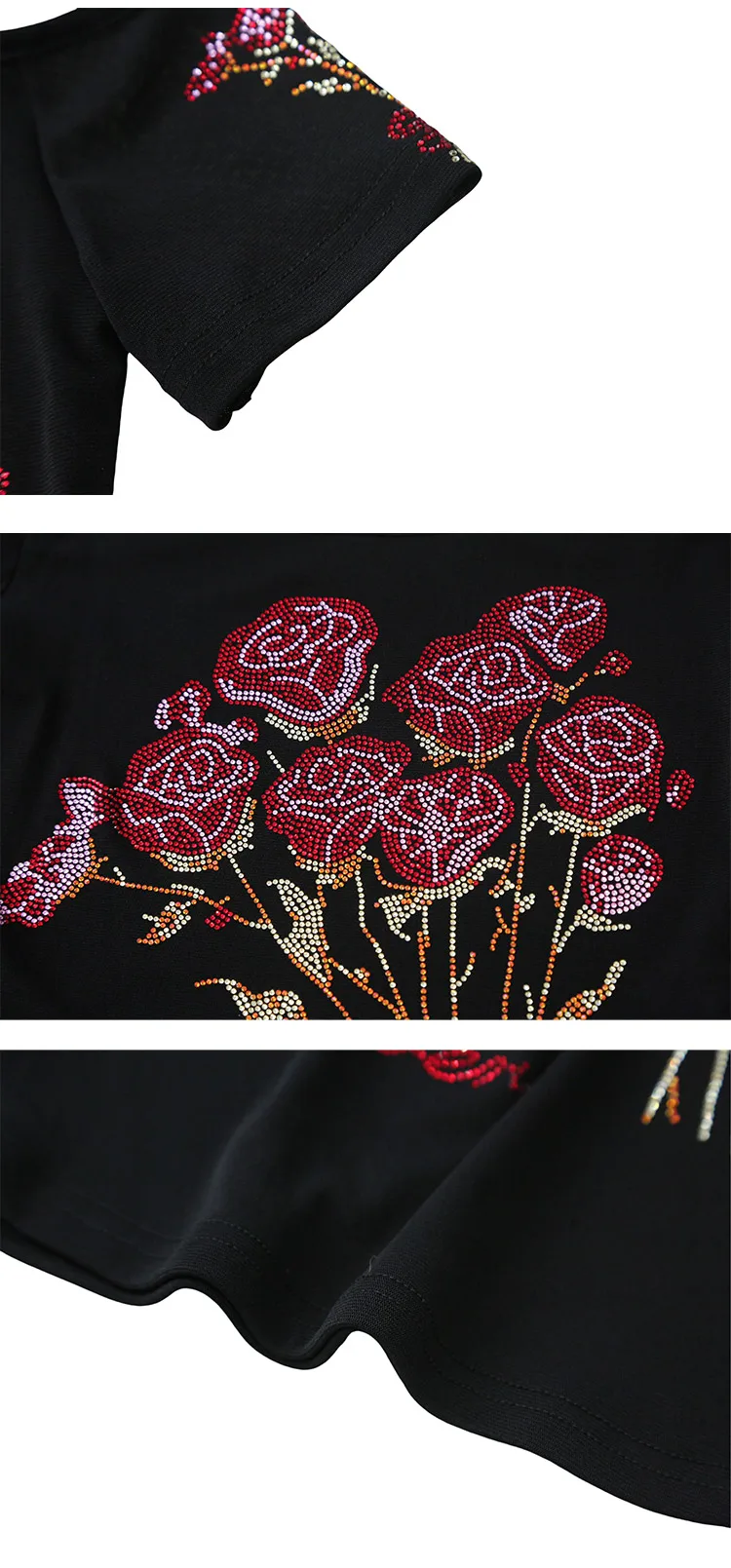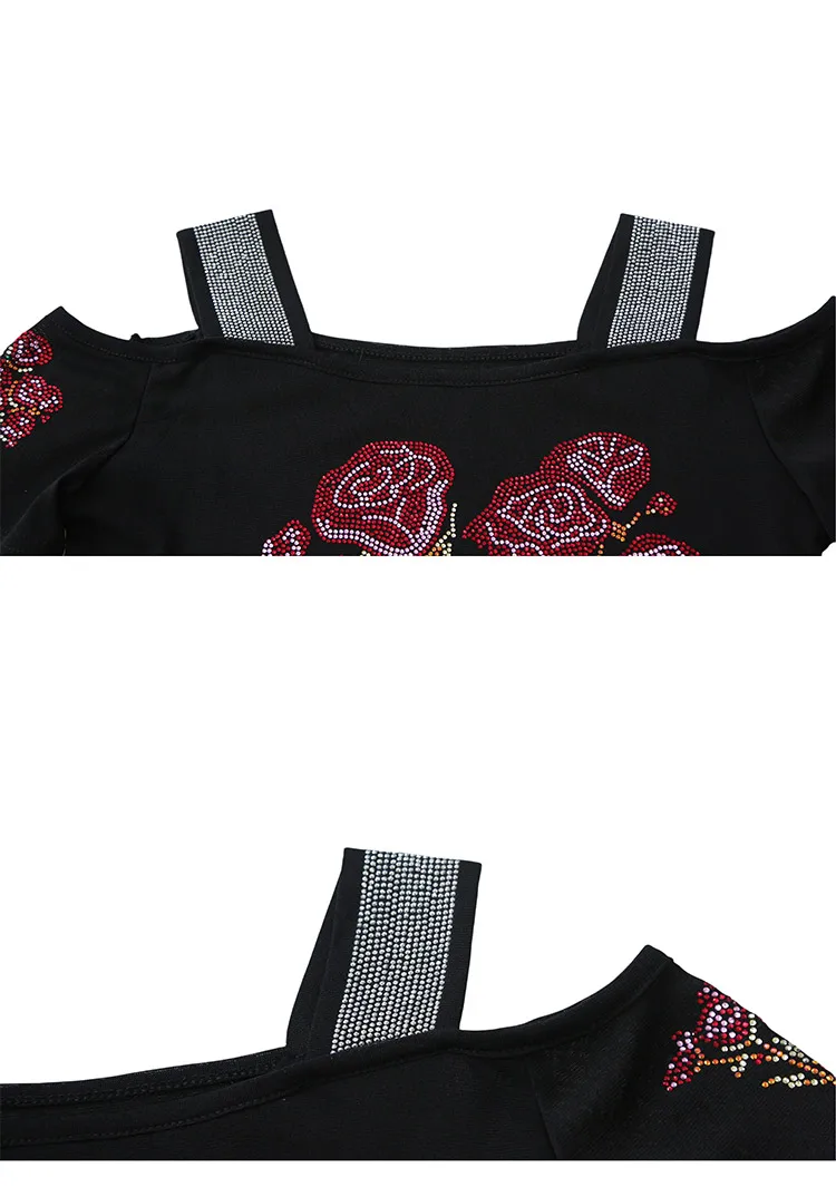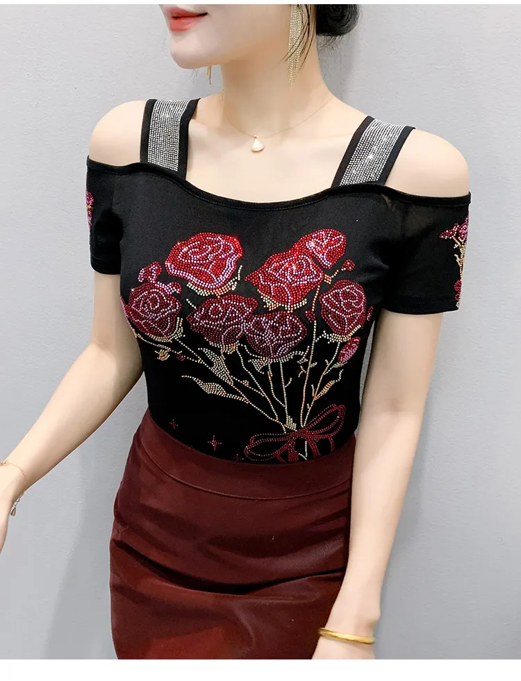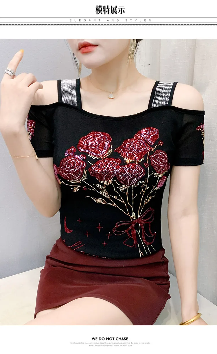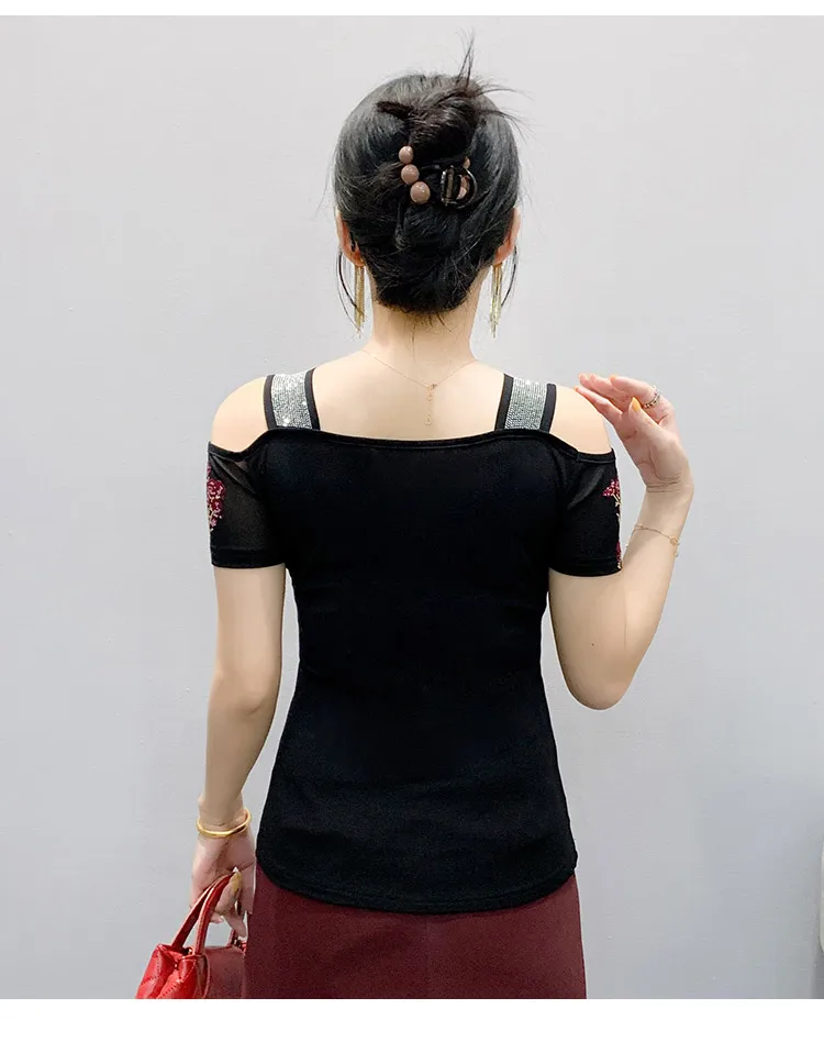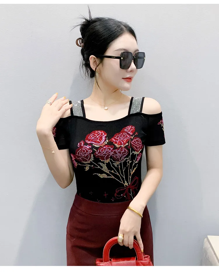 Sexy Off Shoulder T Shirt For Women Luxury Flower Diamonds Short Sleeve Tee Summer Fashion Womens Mesh Tee Shirts Top
