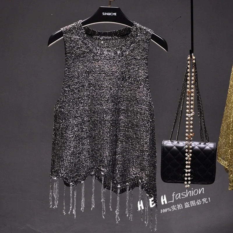 Sexy Shiny Gold Silver Knitted Tank Tops Women Bling Bling Sequined Tassels Knitted Vest All Neon Store Clothes Korean