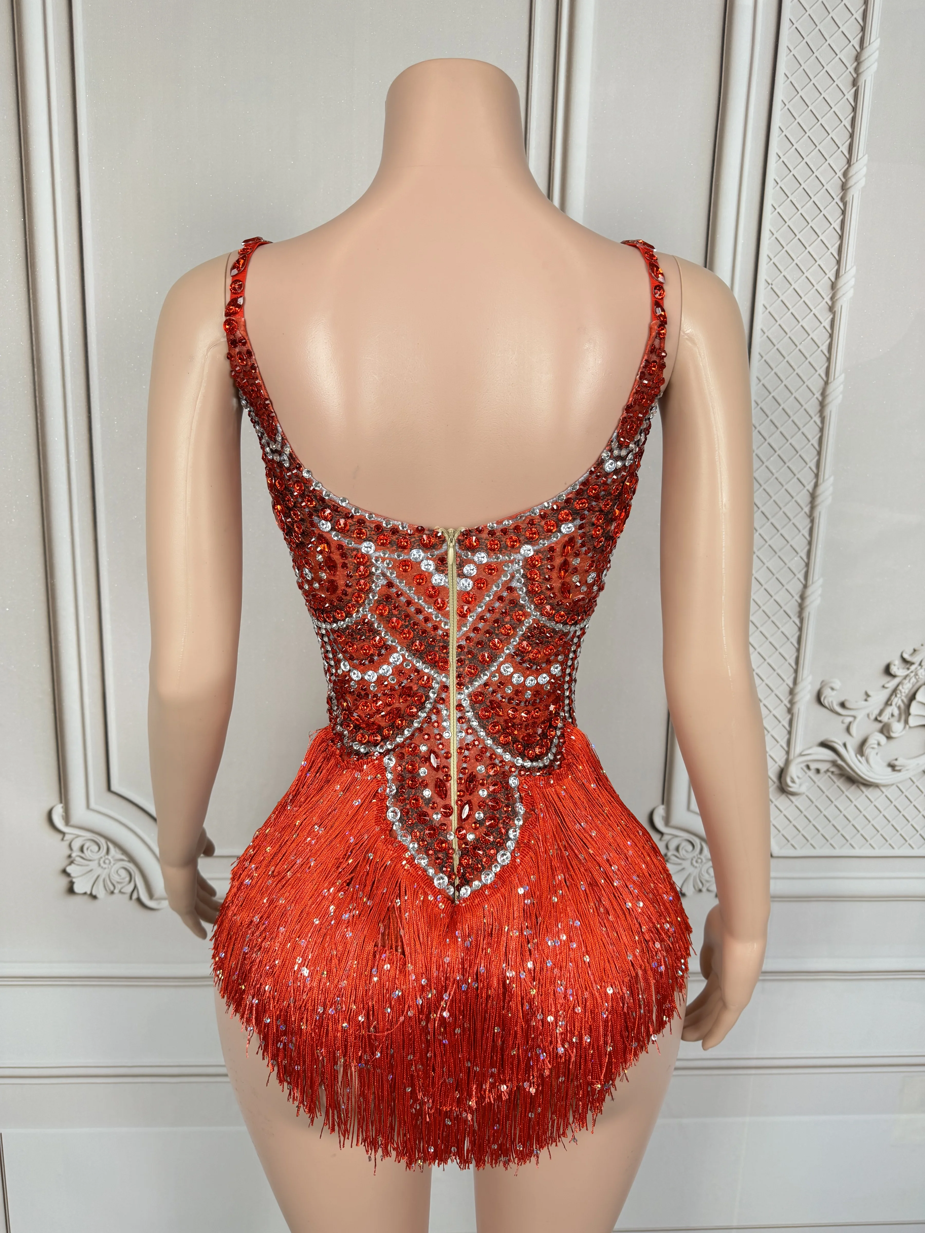 Sexy Sparkly Red Rhinestones Tassels Bodysuit Women Show Performance Dance Costume Nightclub Outfit Singer Dancer Stage Wear